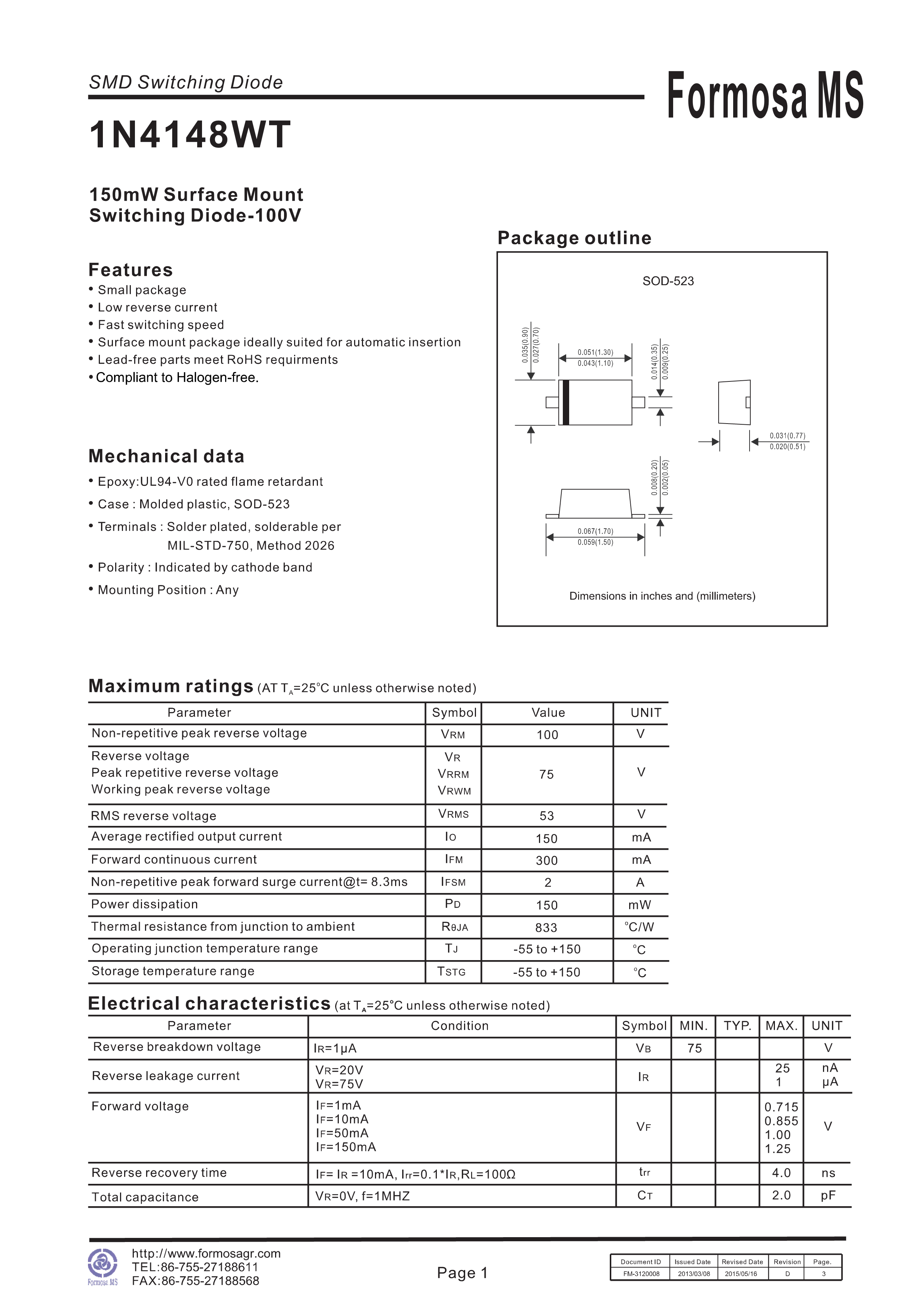 1N4148WT数据手册SOD-523封装AnBon(台湾安邦)PDF规格书,中英文下载