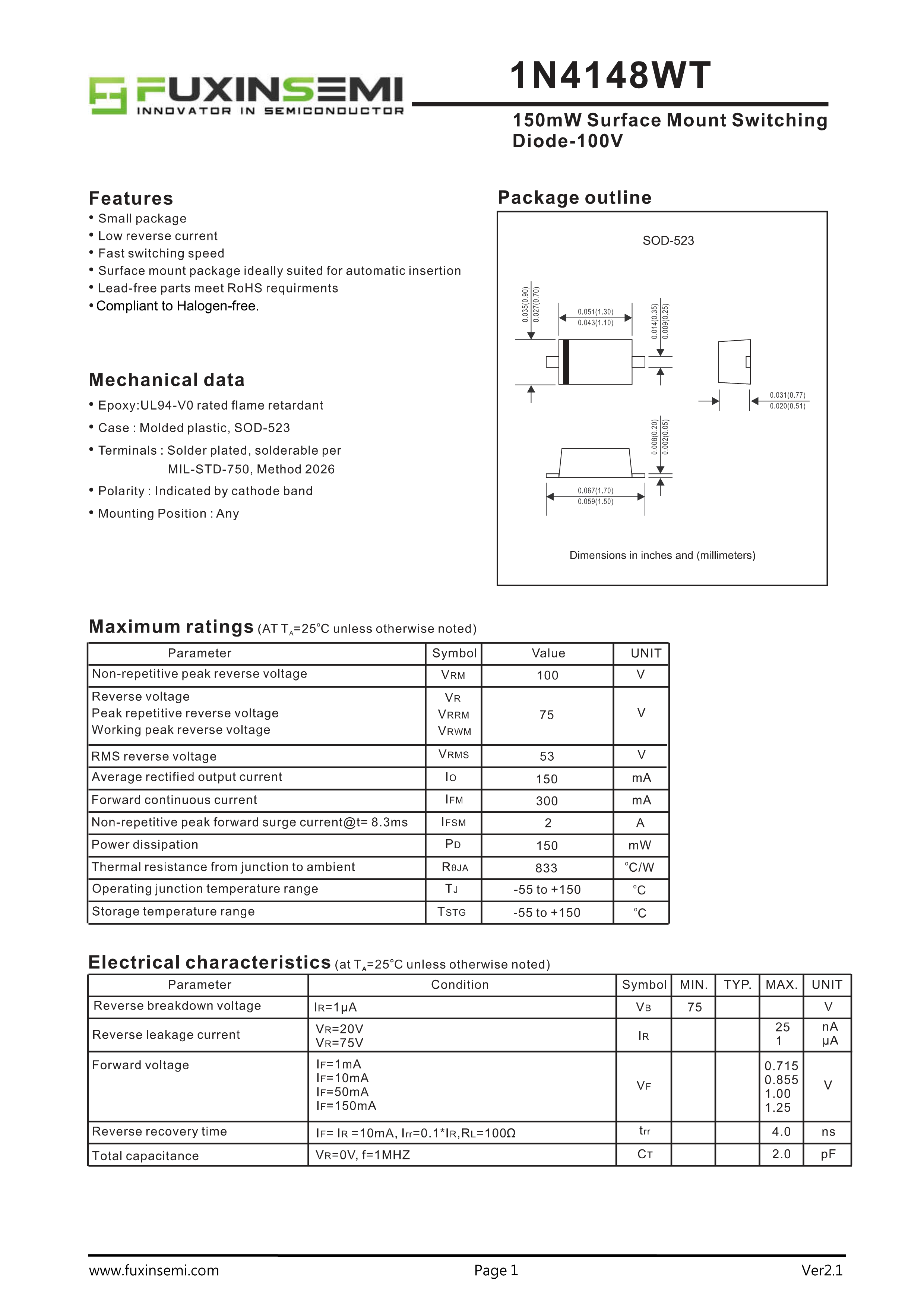 1N4148WT数据手册SOD-523封装FUXINSEMI(富芯森美)PDF规格书,中英文下载