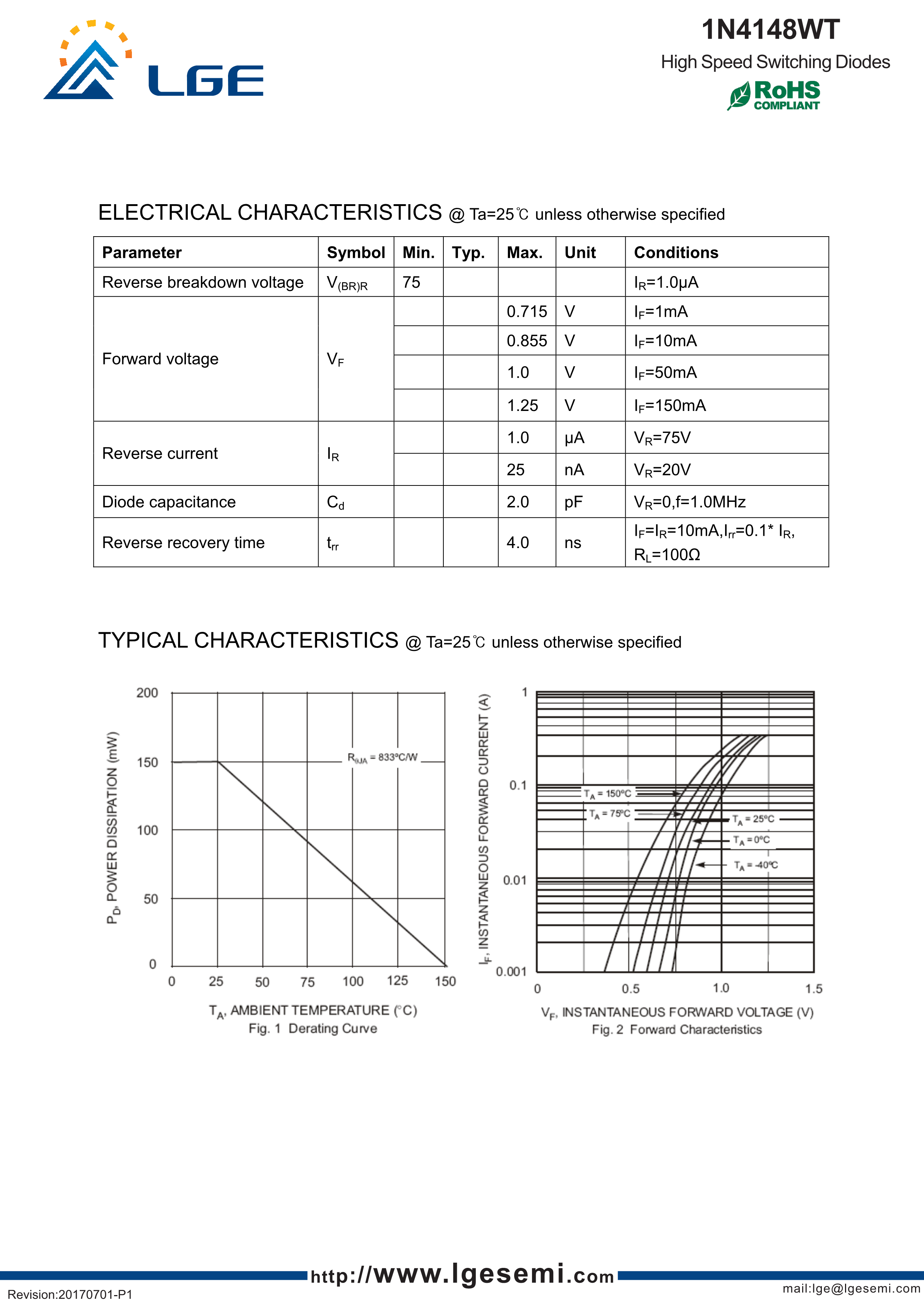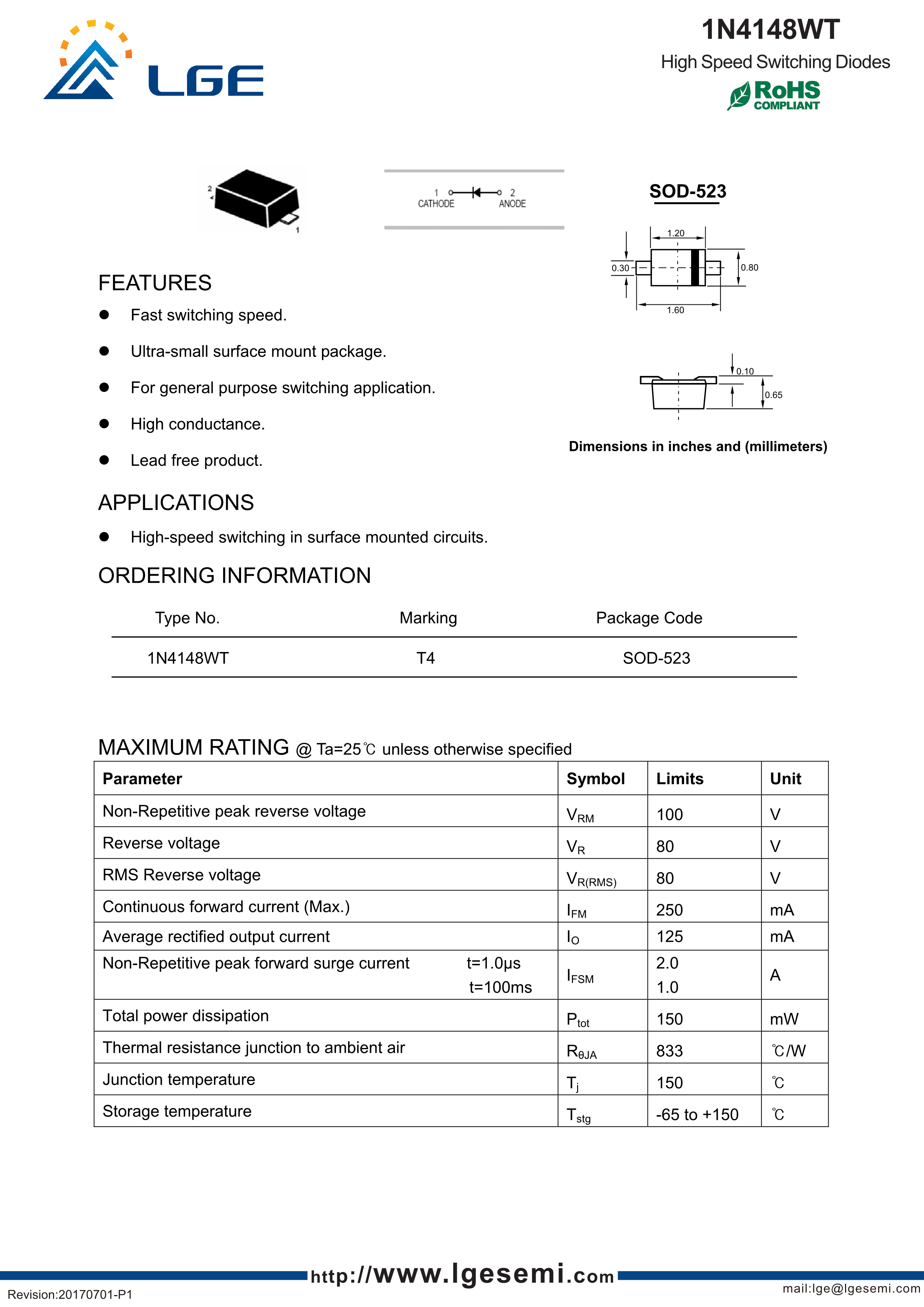 1N4148WT数据手册SOD-523封装LGE(鲁光)PDF规格书,中英文下载