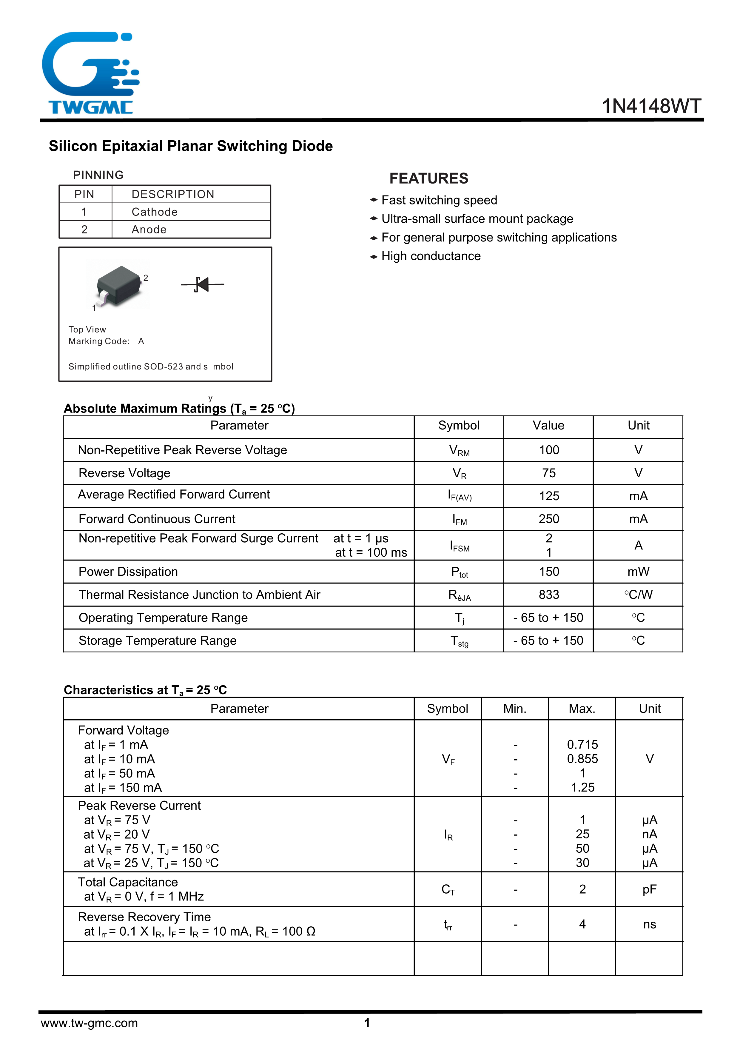 1N4148WT数据手册SOD-523封装TWGMC(台湾迪嘉)PDF规格书,中英文下载
