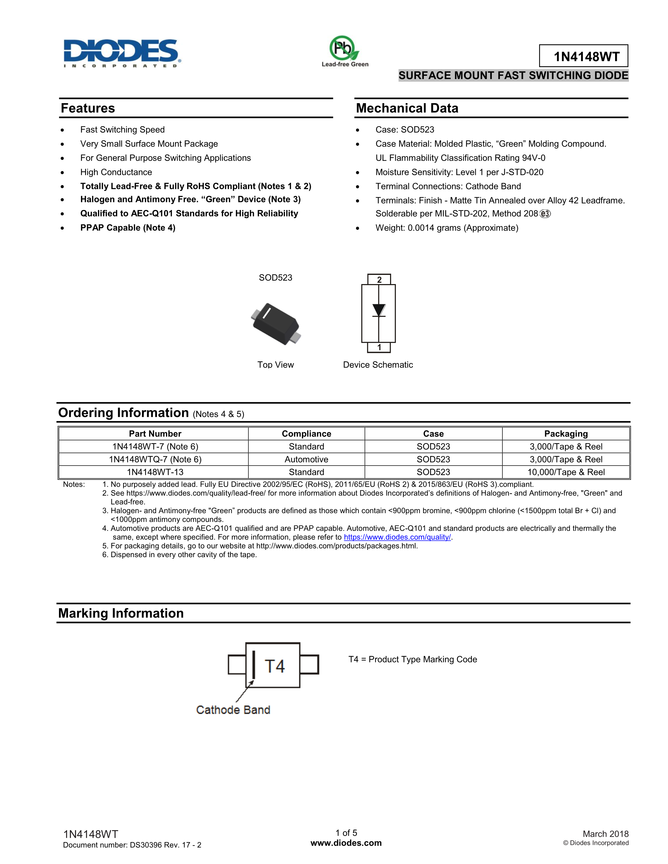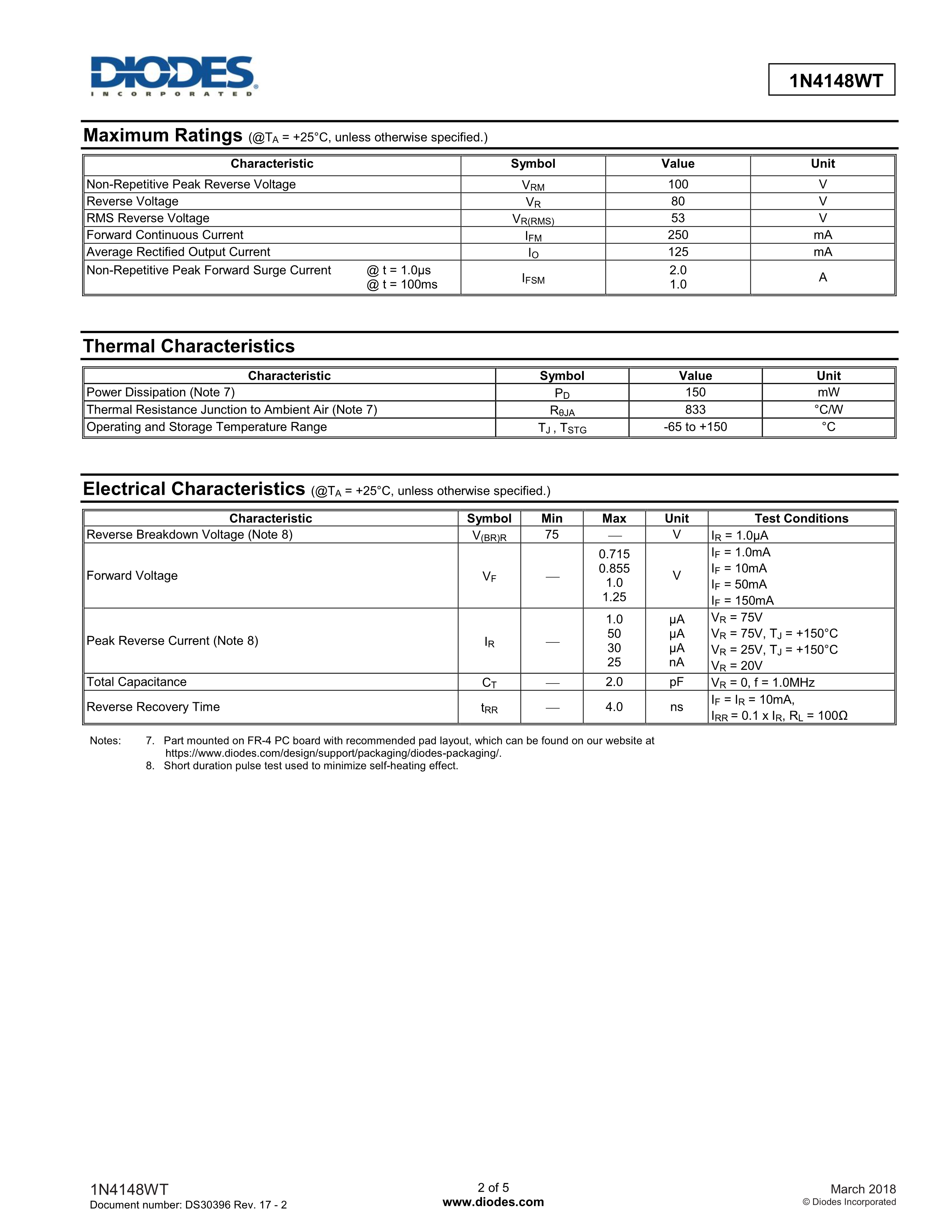 1N4148WTQ-7数据手册SOD-523封装DIODES(美台)PDF规格书,中英文下载