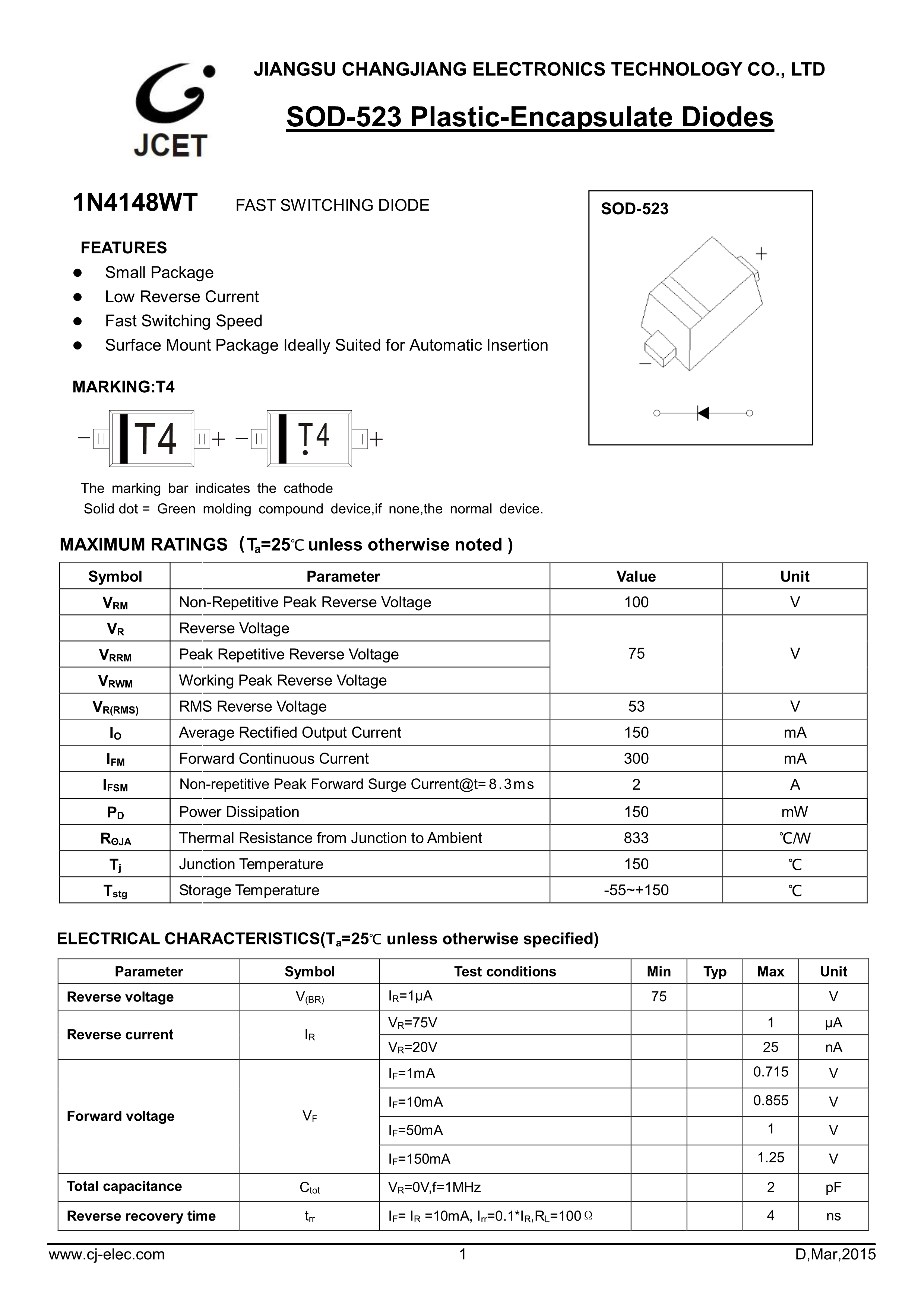 1N4148WT T4数据手册SOD-523封装CJ(江苏长电-长晶)PDF规格书,中英文下载