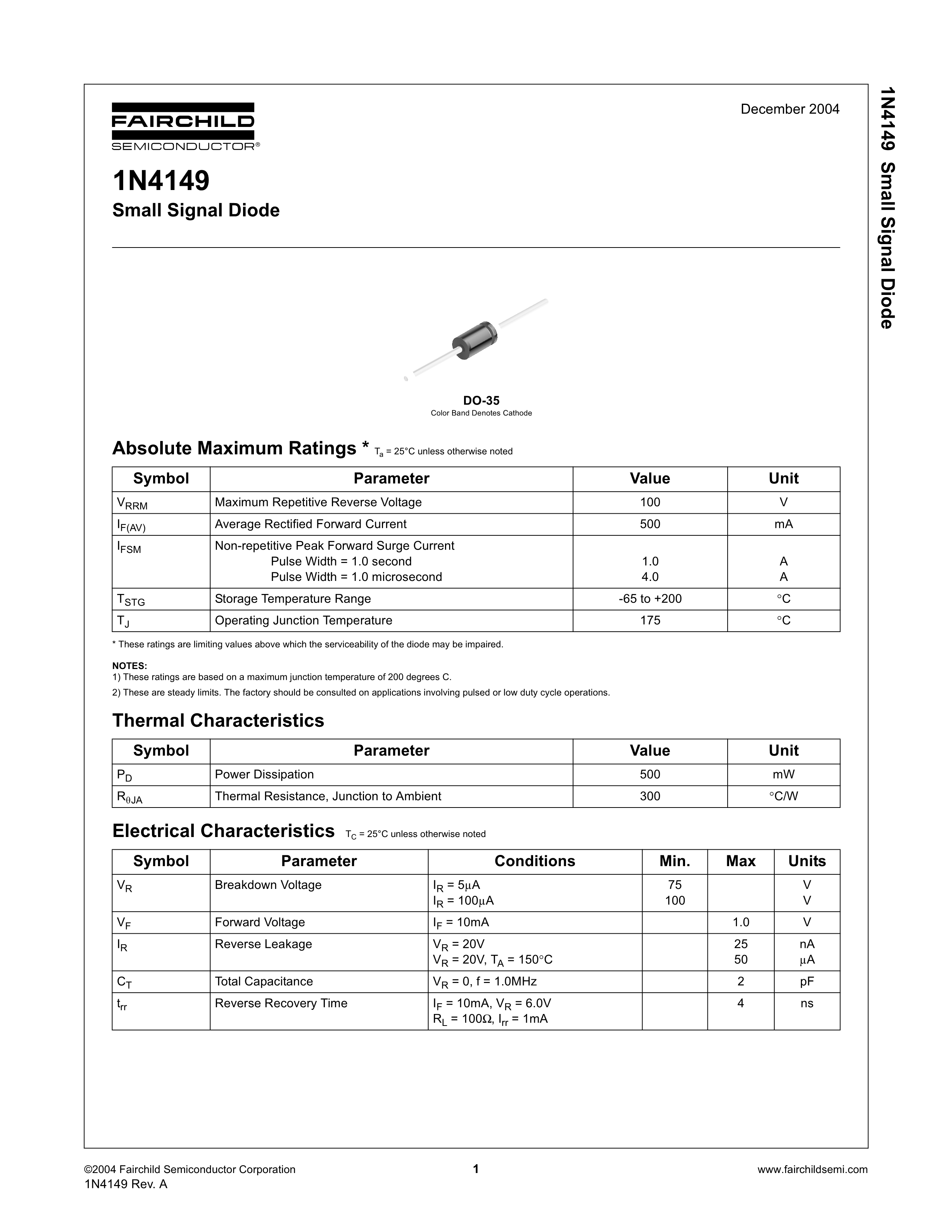 1N4149TR数据手册DO-35封装onsemi(安森美)PDF规格书,中英文下载