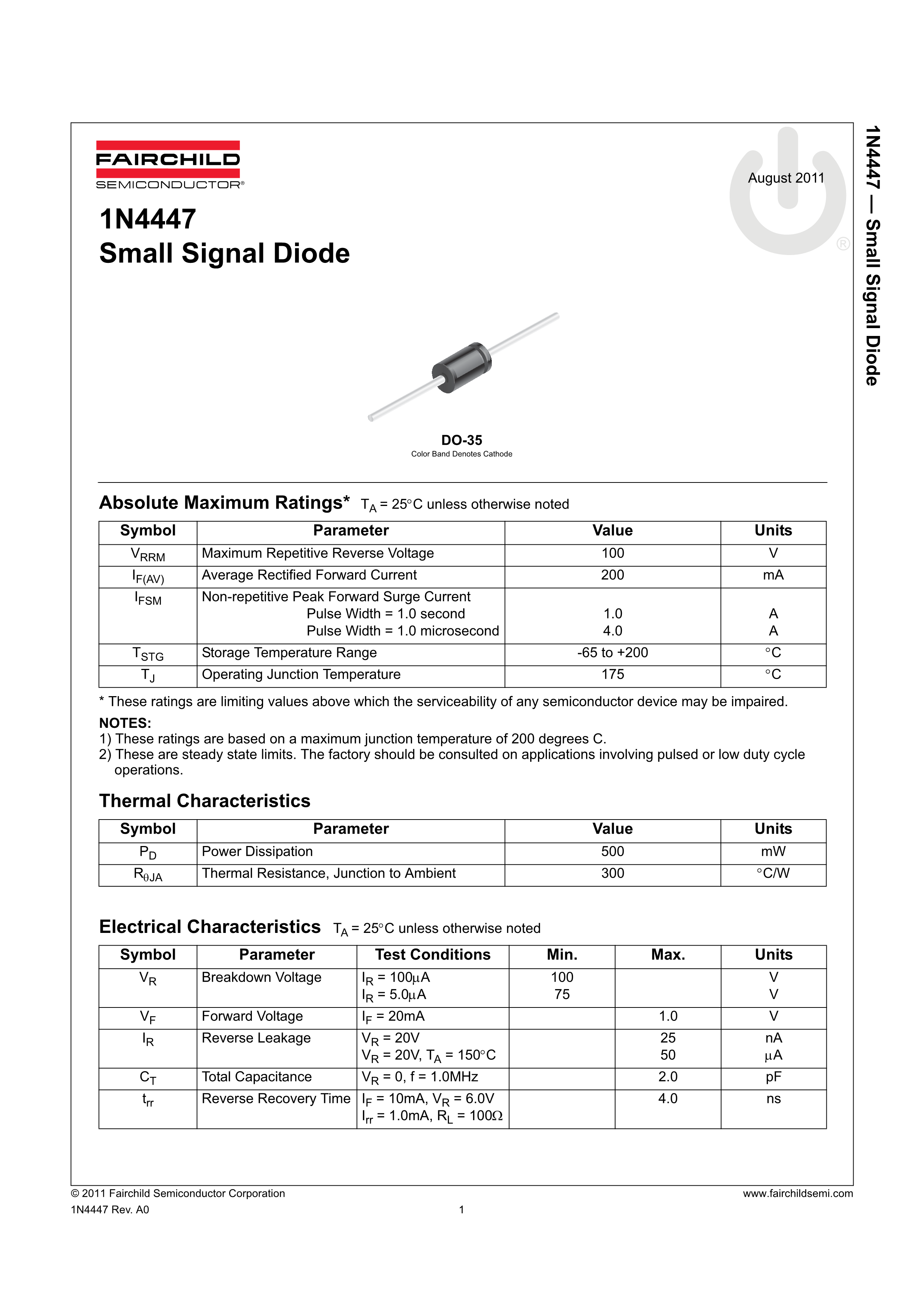 1N4447数据手册DO-35封装onsemi(安森美)PDF规格书,中英文下载