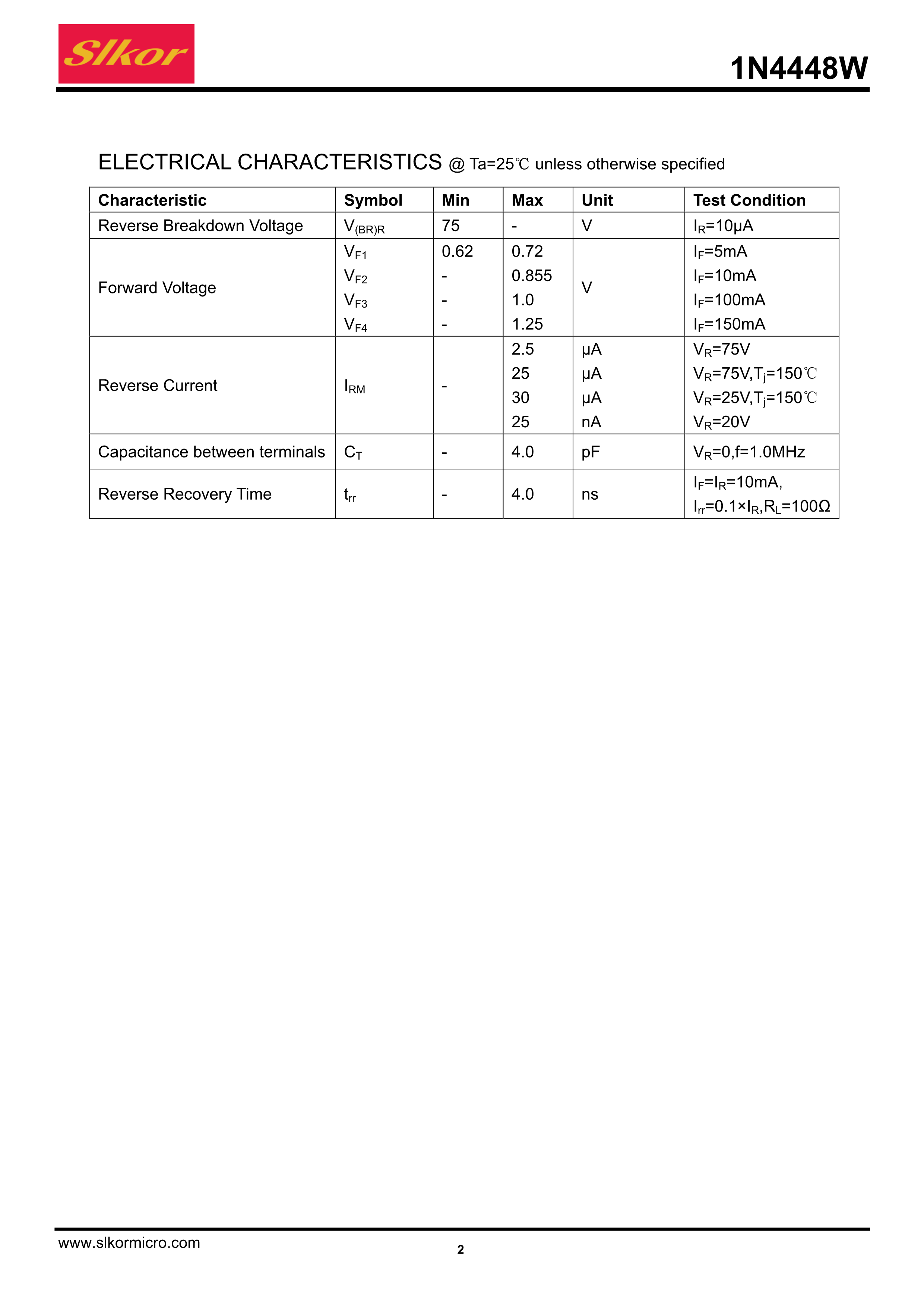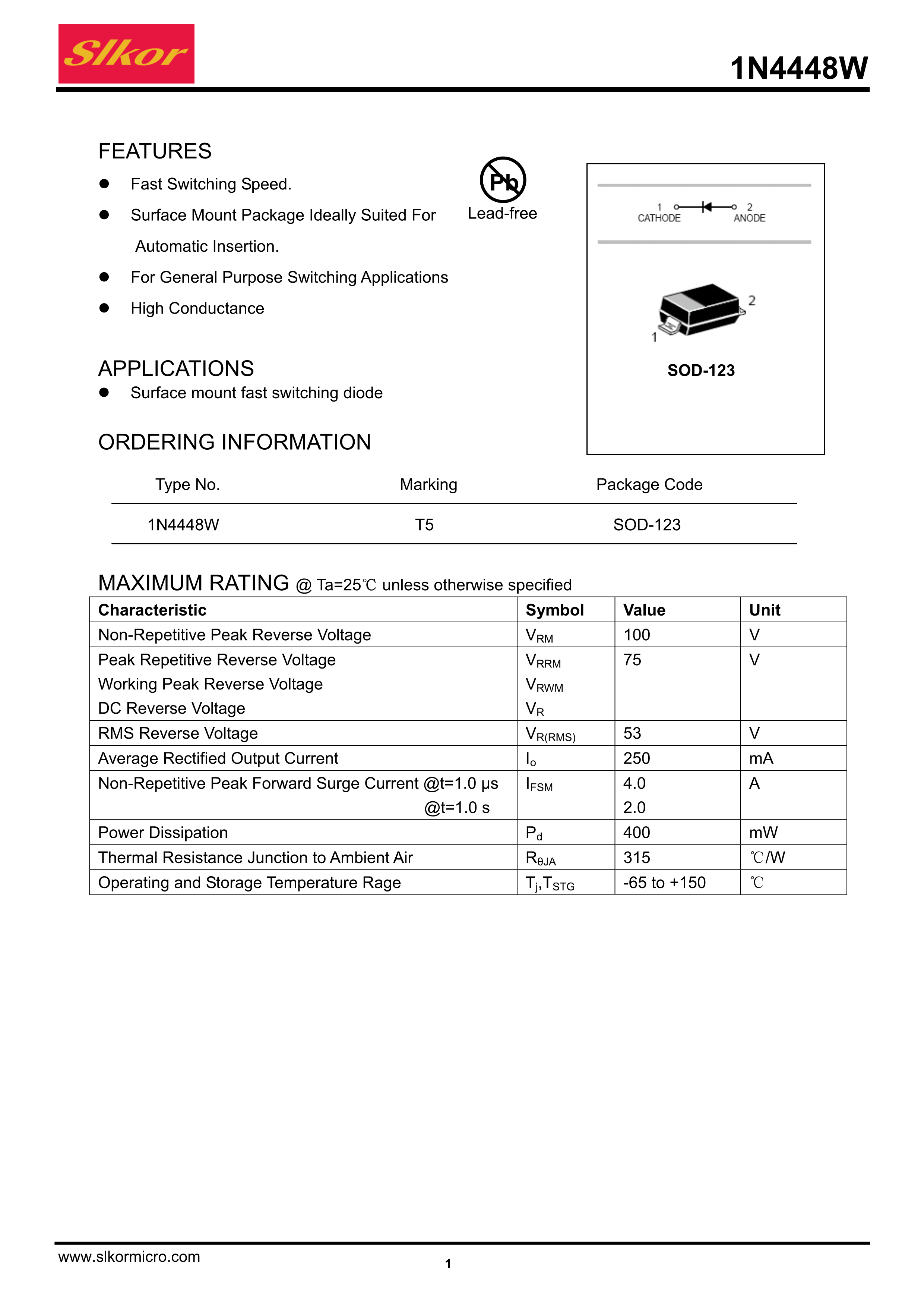 1N4448W数据手册SOD-123封装Slkor(萨科微)PDF规格书,中英文下载