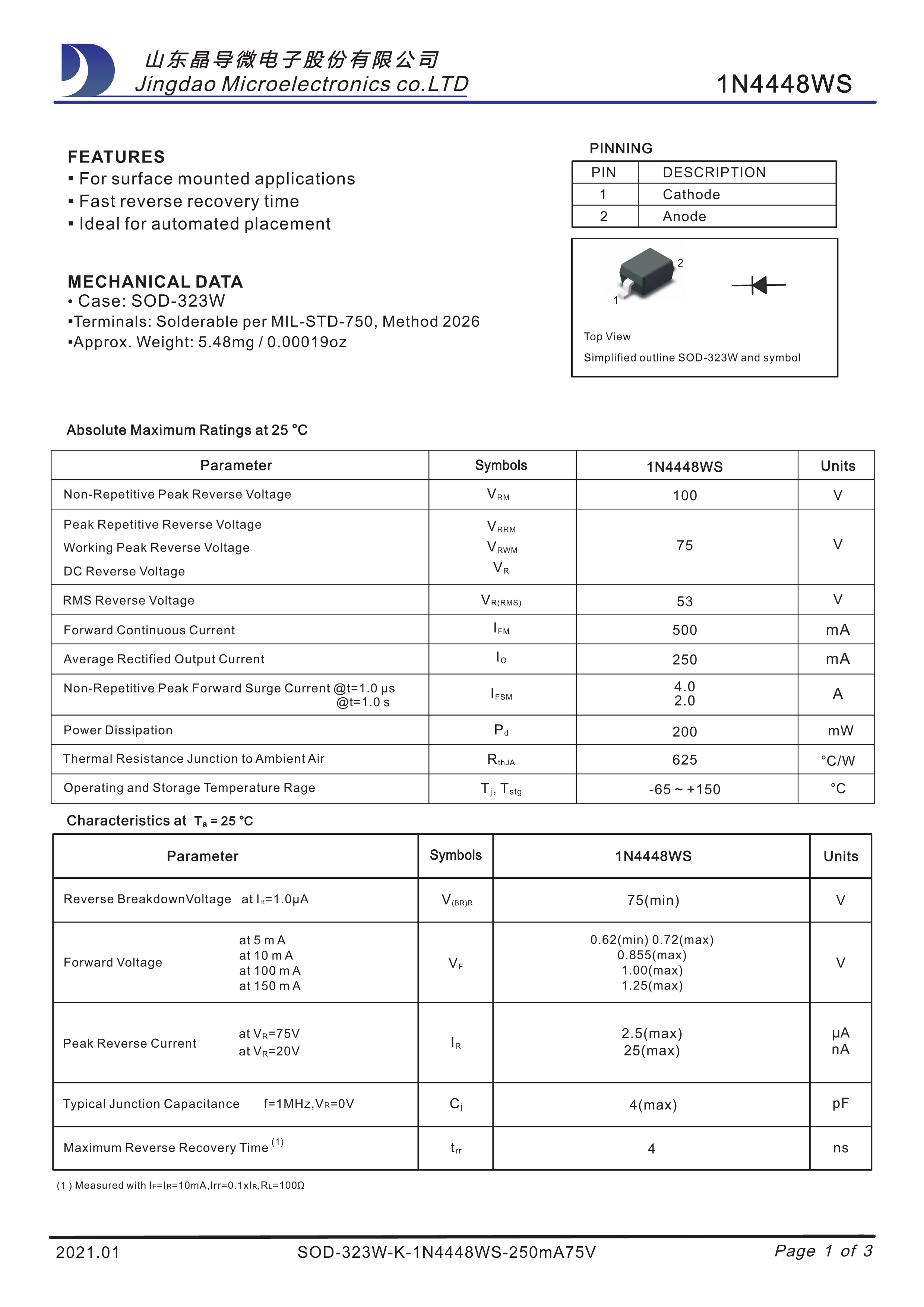 1N4448WS数据手册SOD-323W封装晶导微电子PDF规格书,中英文下载