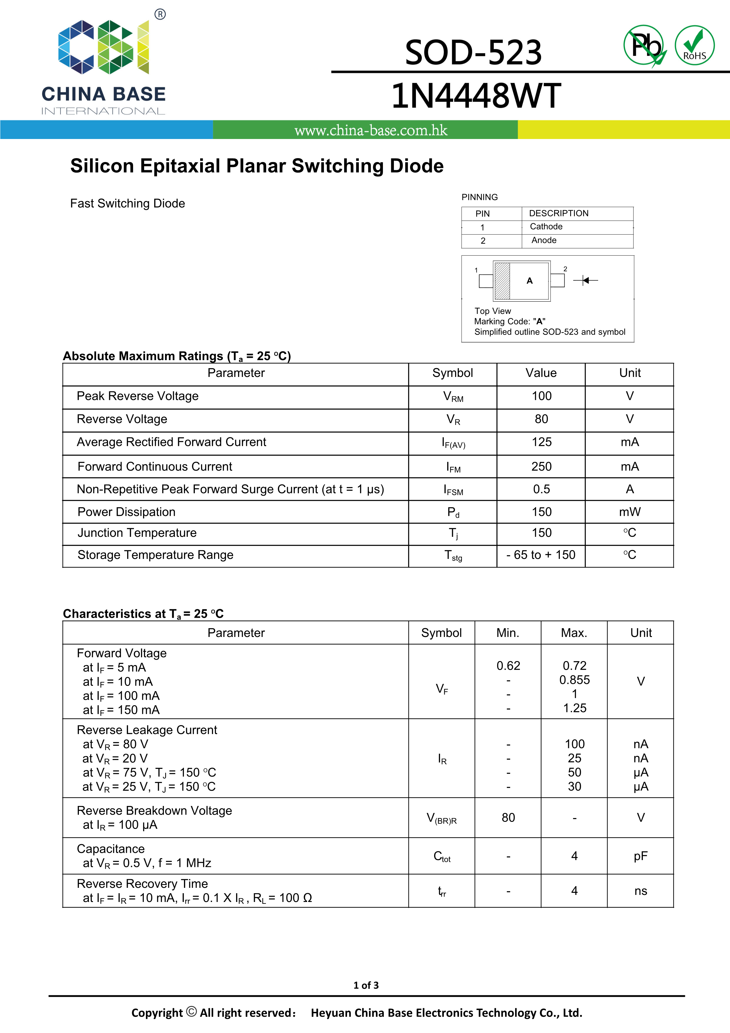 1N4448WT A数据手册SOD-523封装CBI(创基)PDF规格书,中英文下载