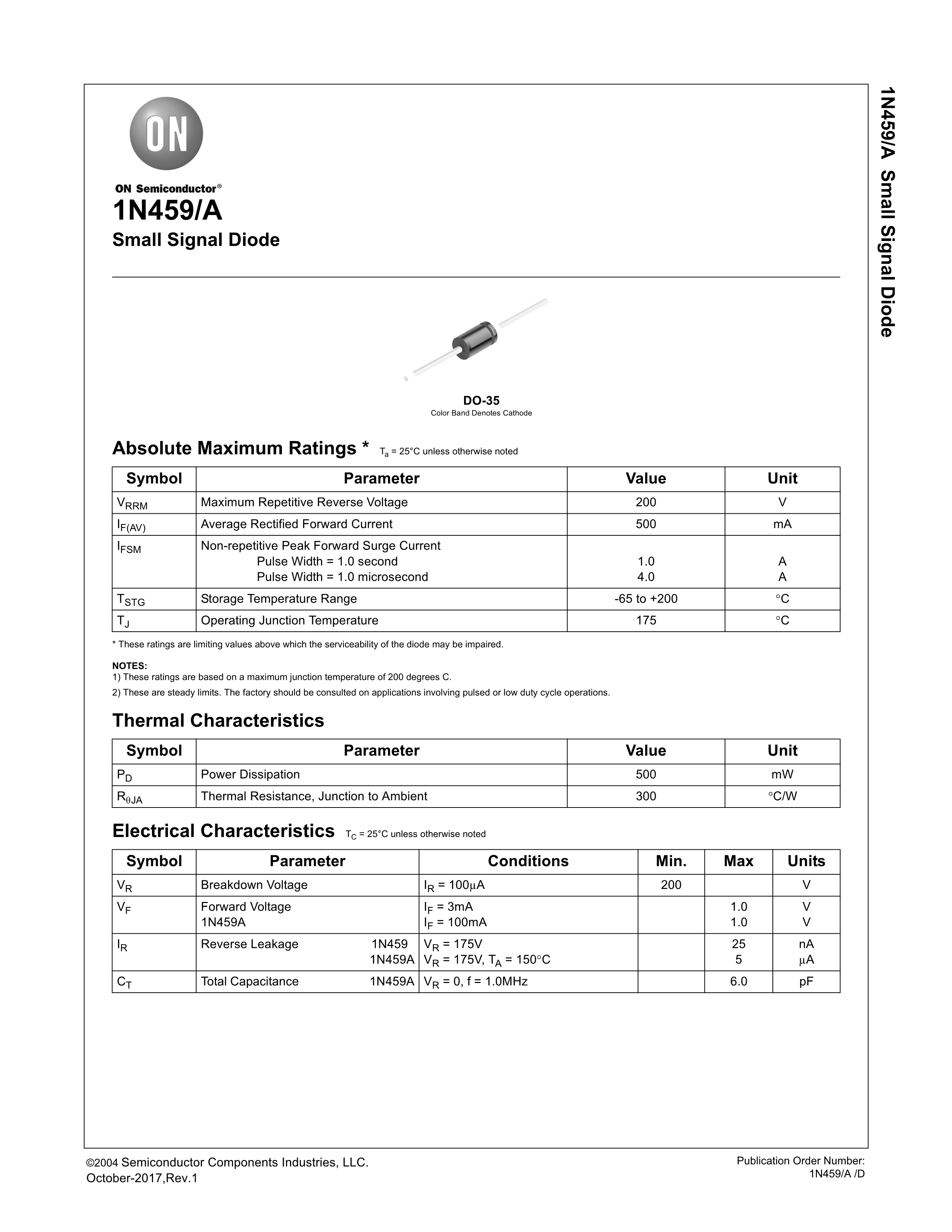 1N459ATR数据手册DO-35封装onsemi(安森美)PDF规格书,中英文下载