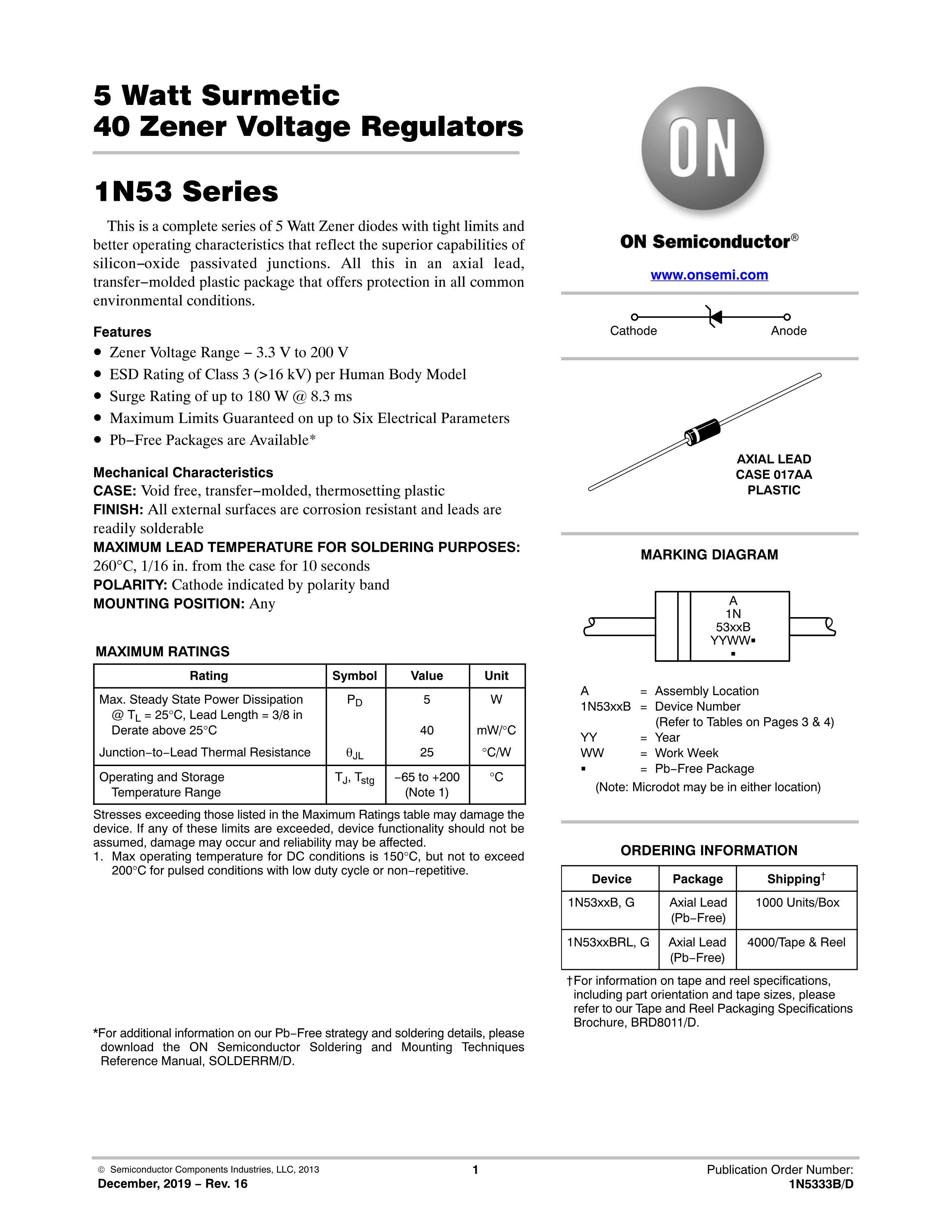 1N5388BG数据手册Axial Lead封装onsemi(安森美)PDF规格书,中英文下载