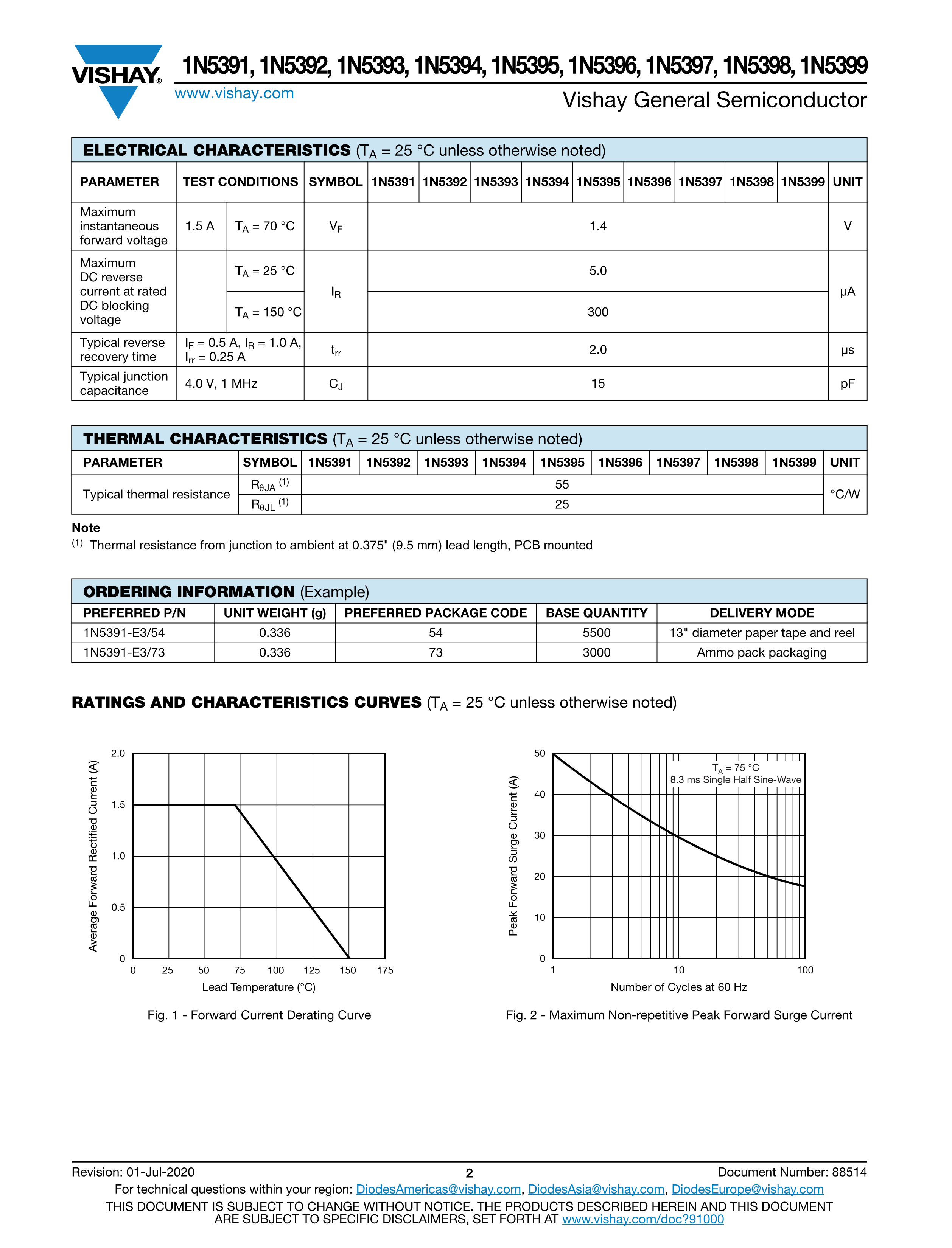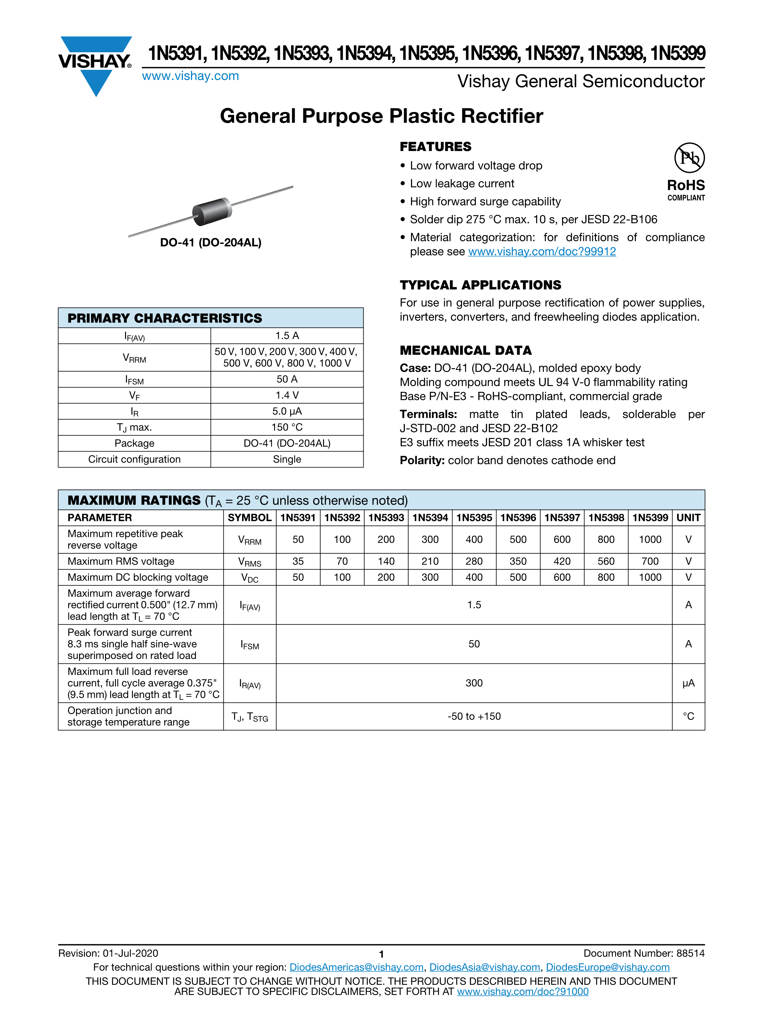 1N5392-E3-54数据手册DO-41封装VISHAY(威世)PDF规格书,中英文下载