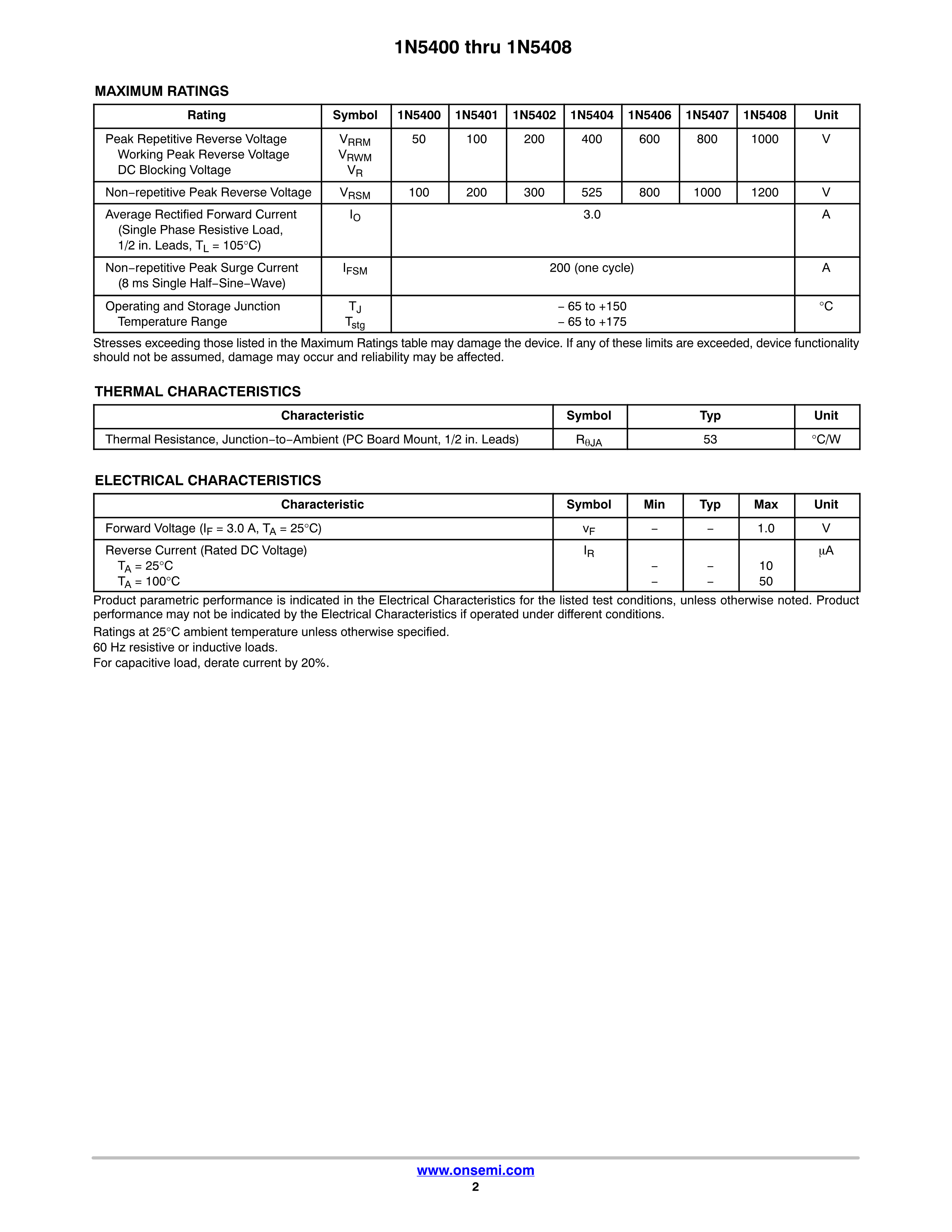 1N5400G数据手册DO-201AD封装onsemi(安森美)PDF规格书,中英文下载