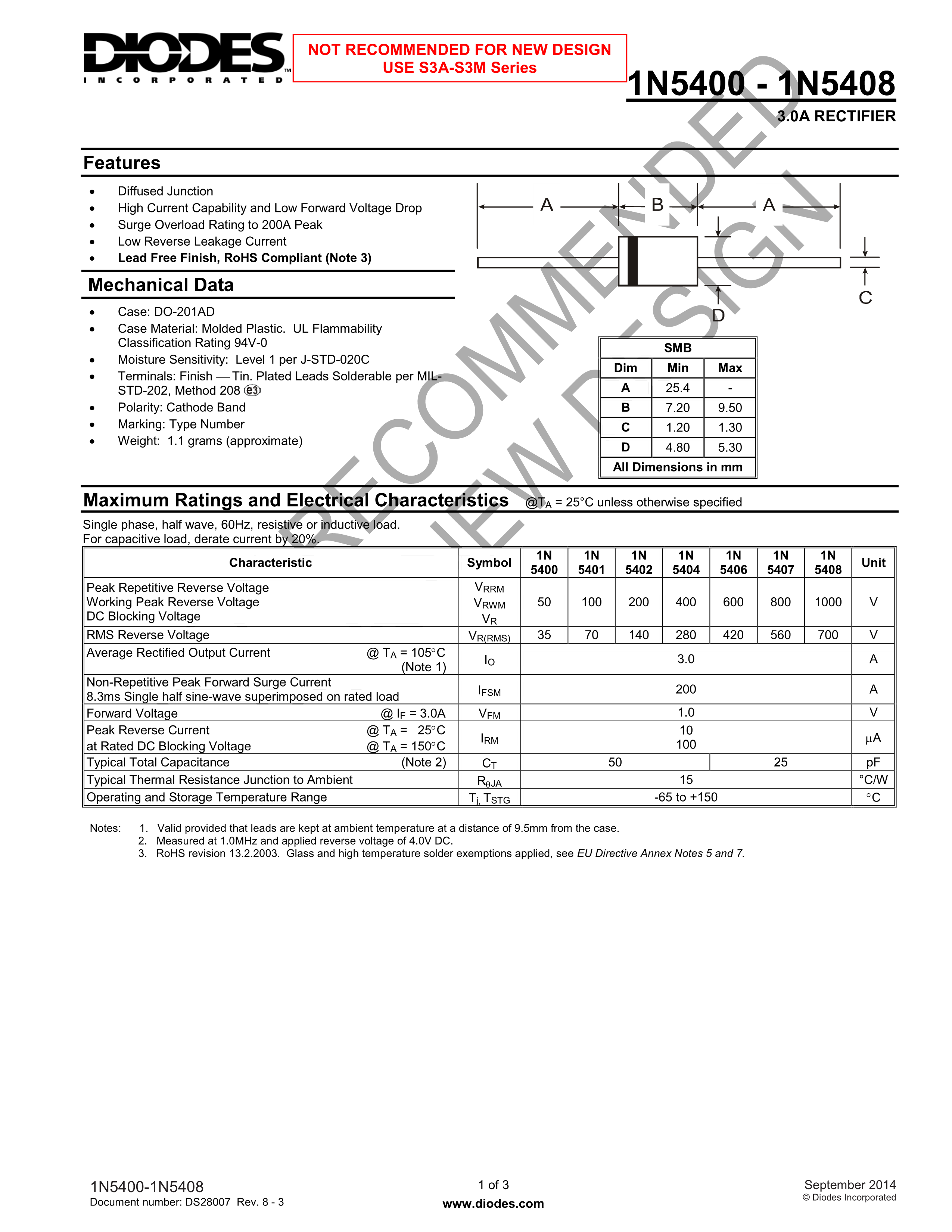 1N5402-T数据手册DO-201AD封装DIODES(美台)PDF规格书,中英文下载