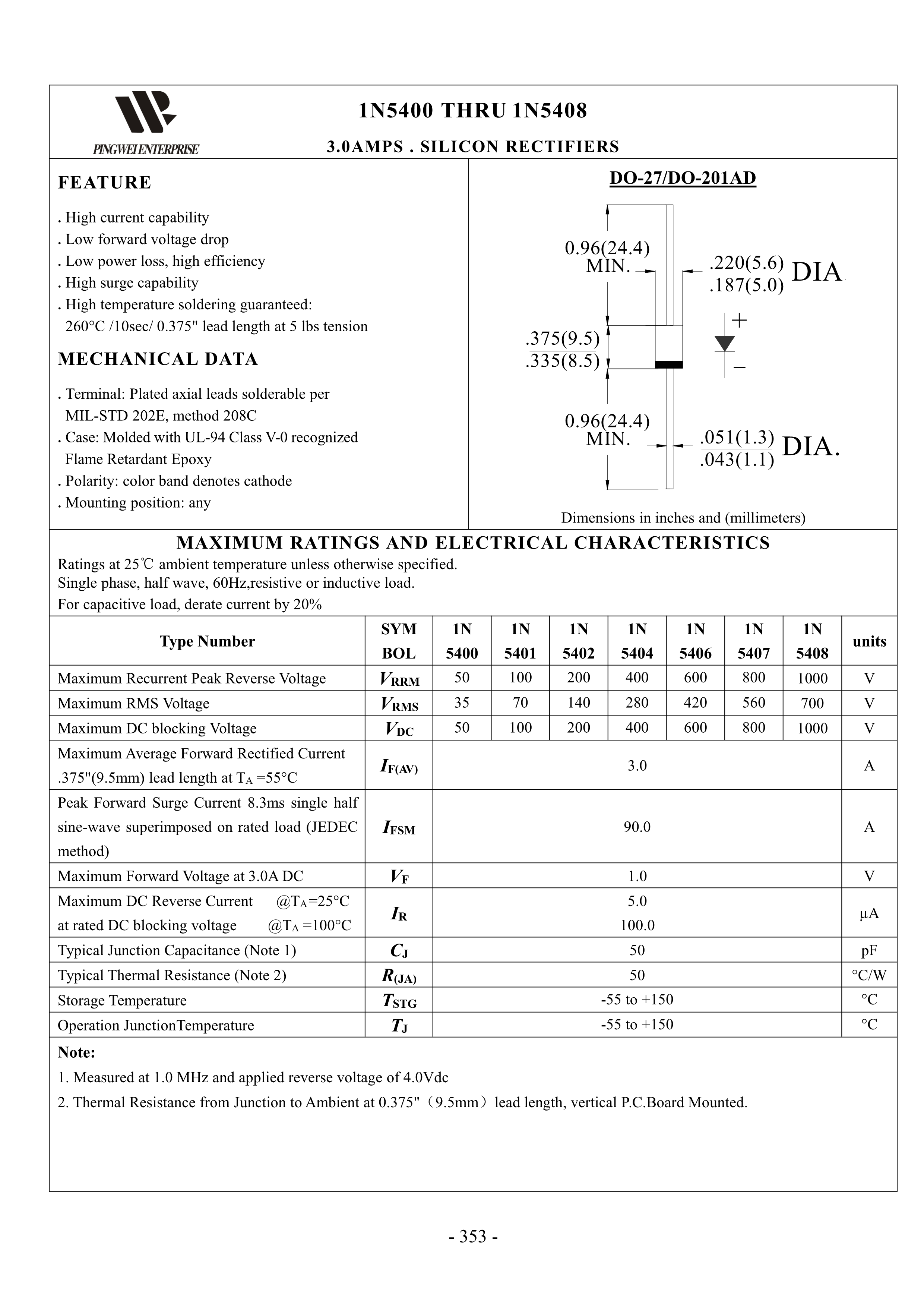 1N5404数据手册DO-201AD封装PINGWEI(平伟)PDF规格书,中英文下载