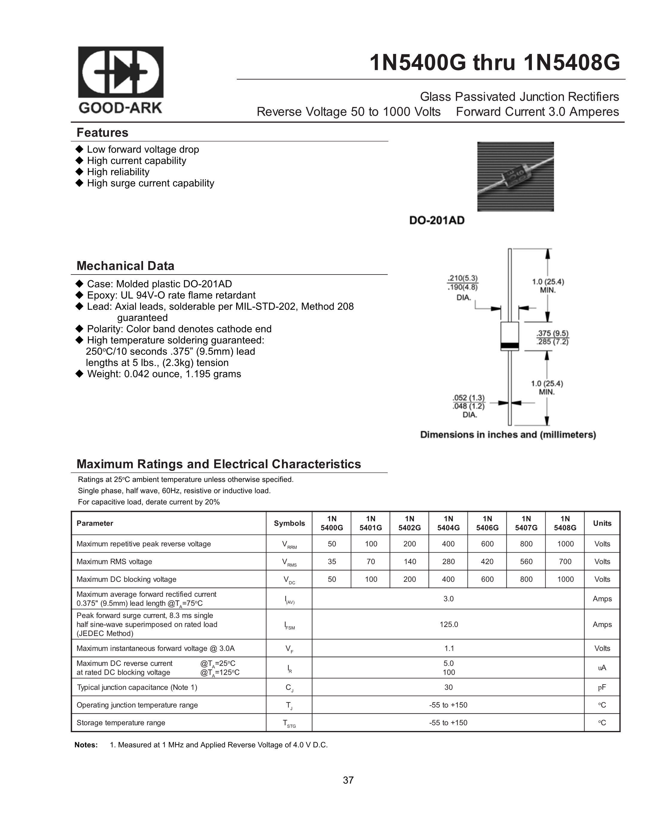 1N5408G数据手册DO-201AD封装GOOD-ARK(固锝)PDF规格书,中英文下载