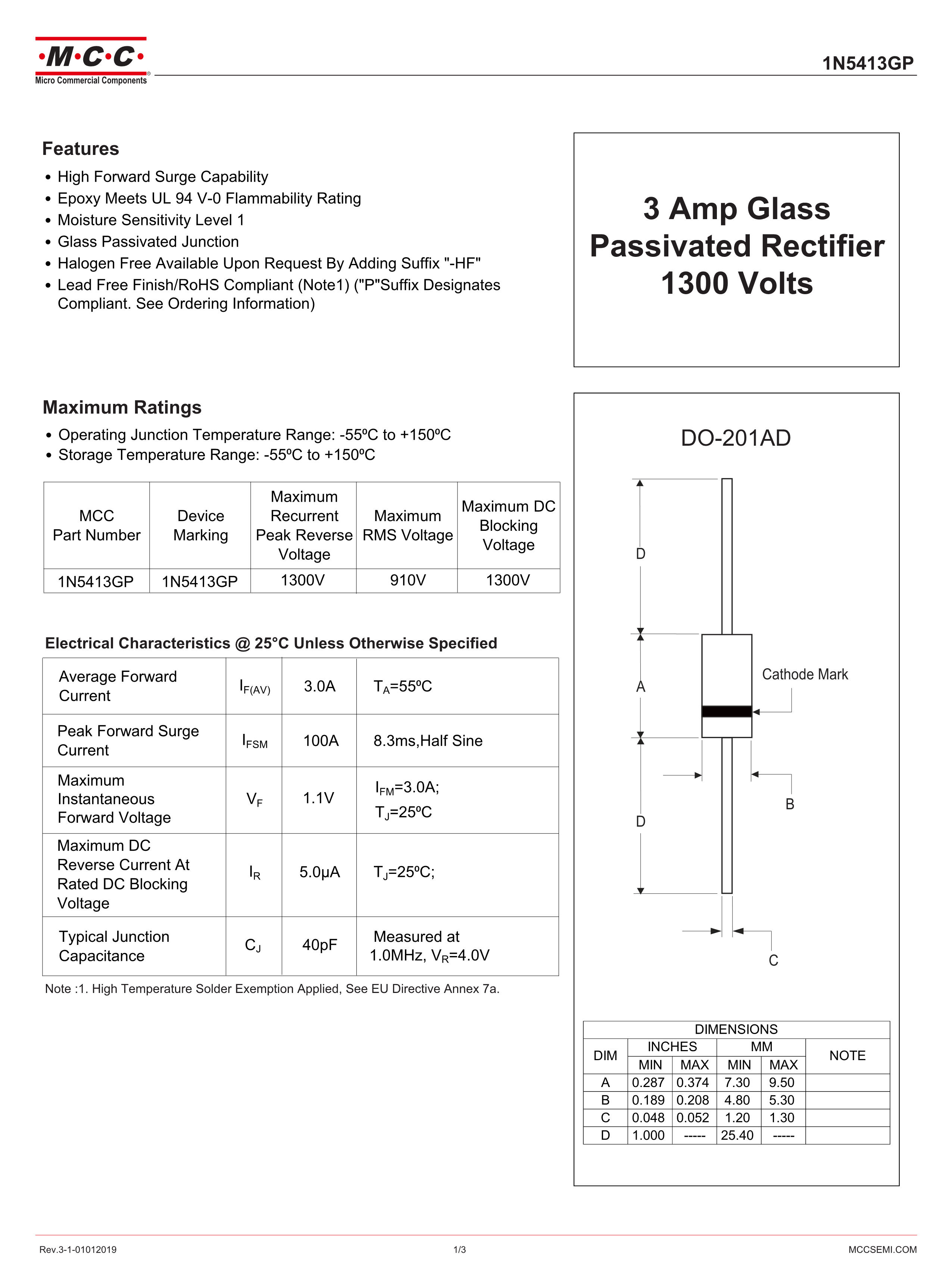 1N5413GP-TP数据手册DO-201AD封装MCC(美微科)PDF规格书,中英文下载