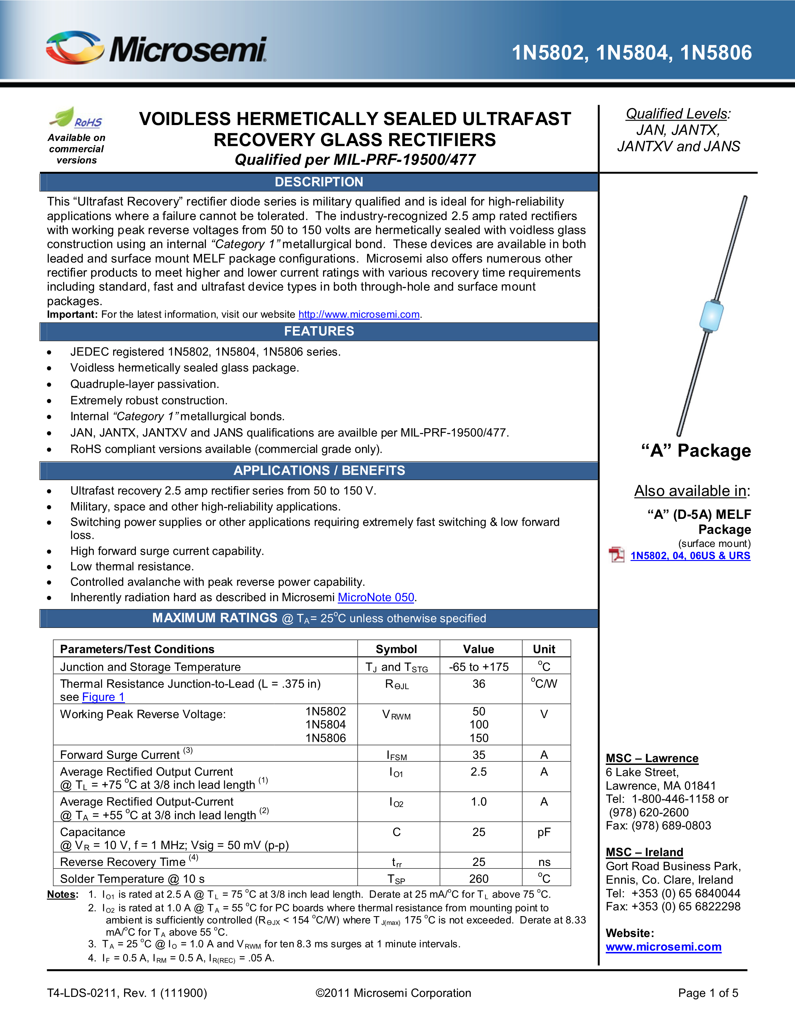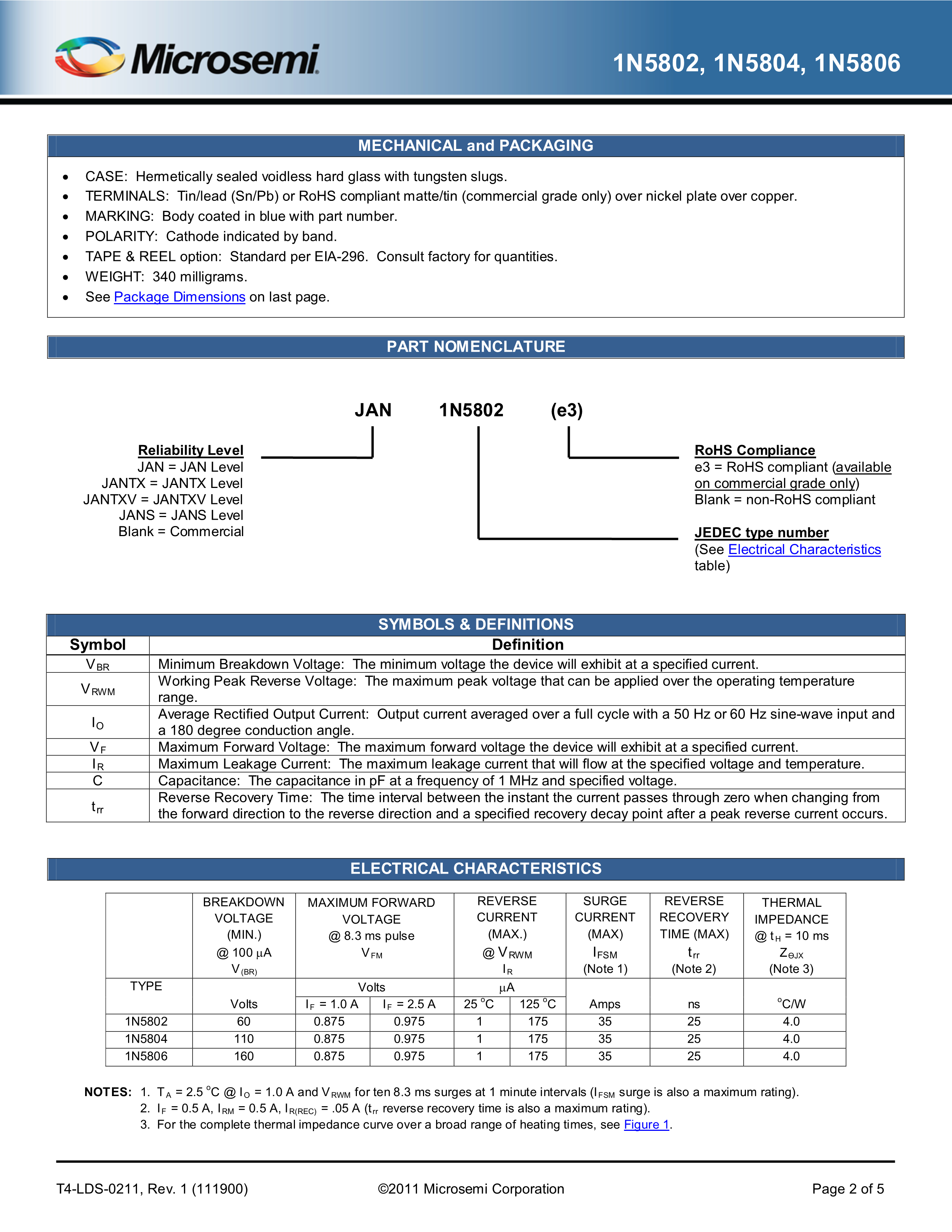 1N5806数据手册轴向引线封装MICROCHIP(美国微芯)PDF规格书,中英文下载