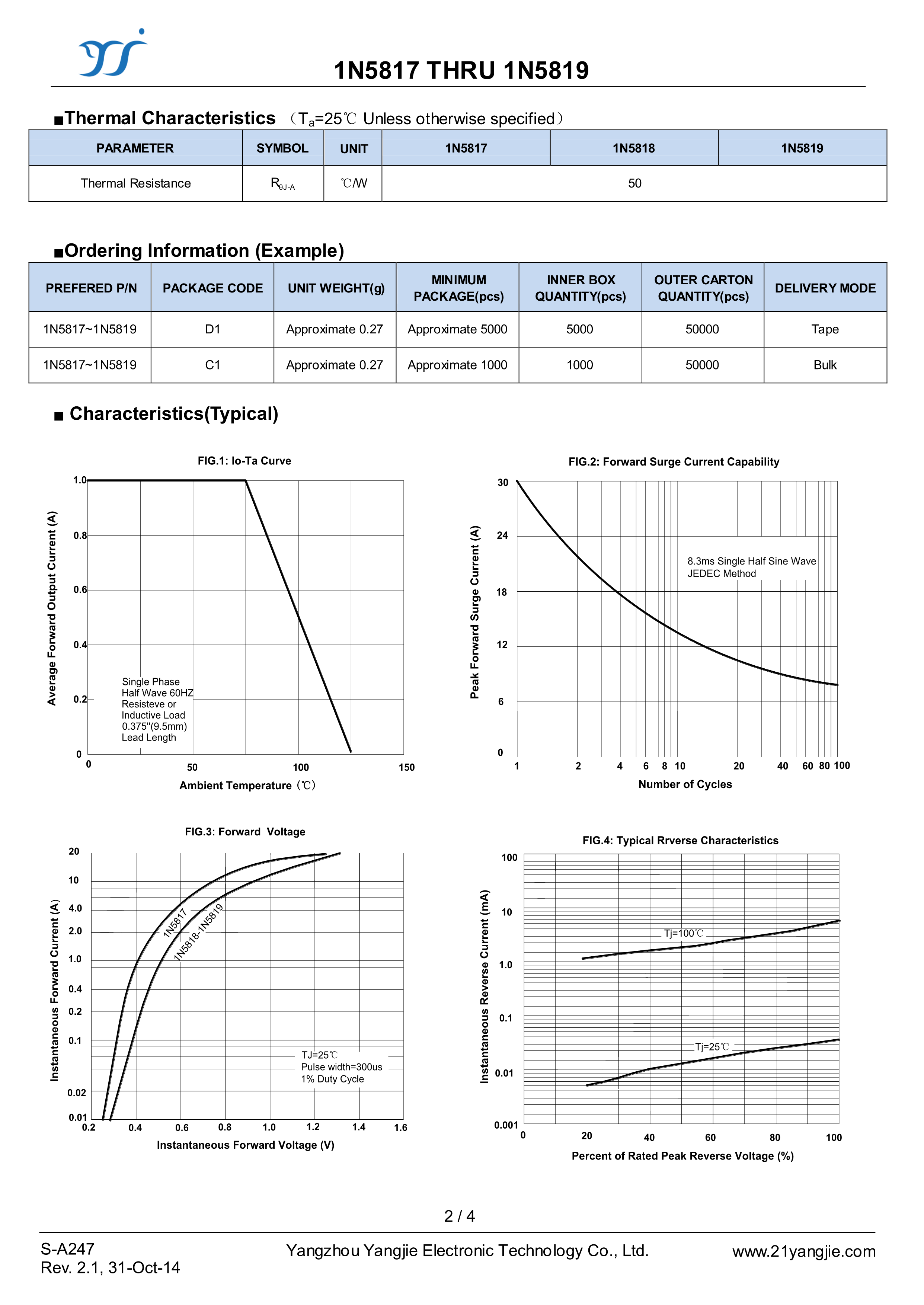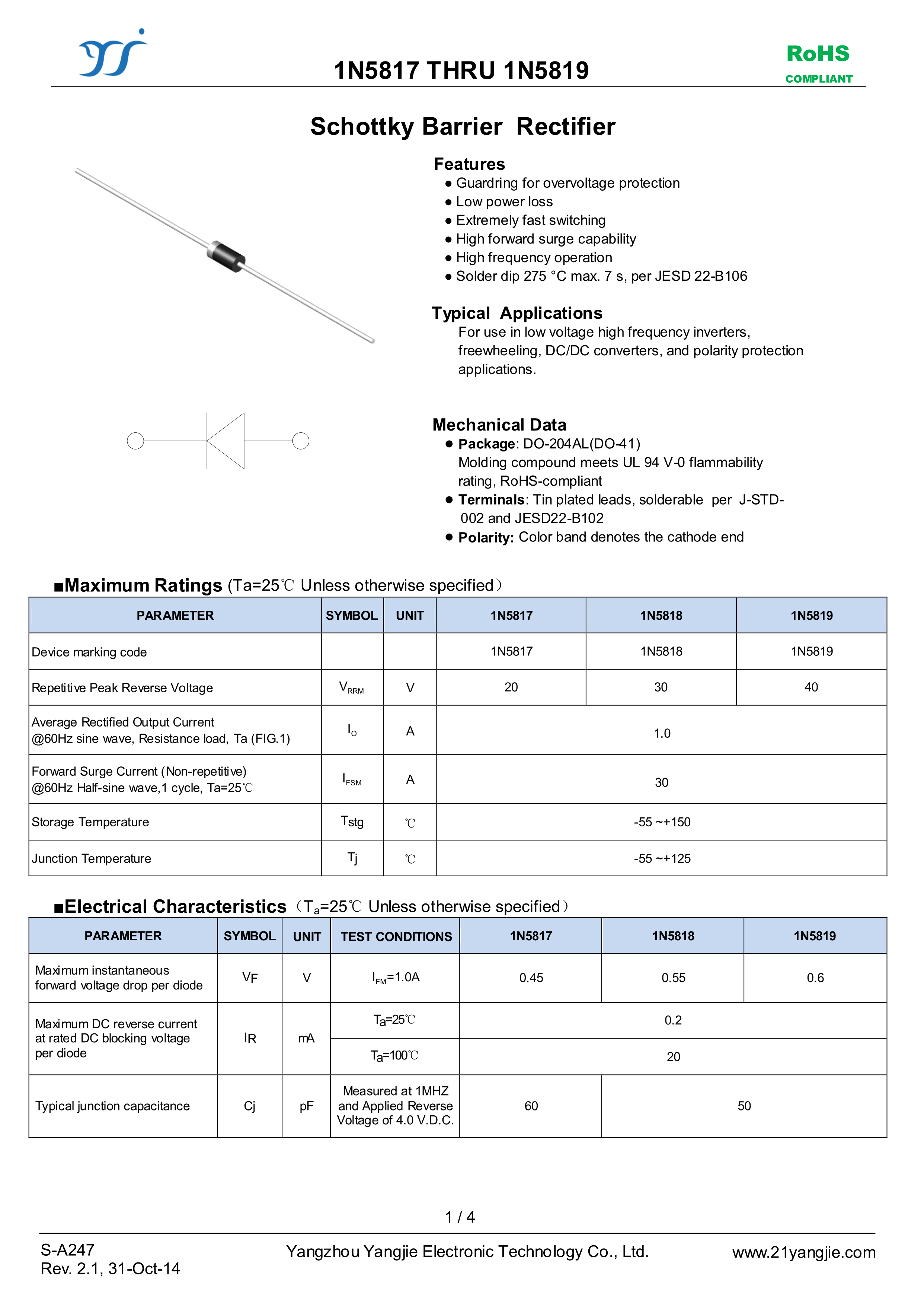 1N5817数据手册DO-41封装YANGJIE(扬杰)PDF规格书,中英文下载