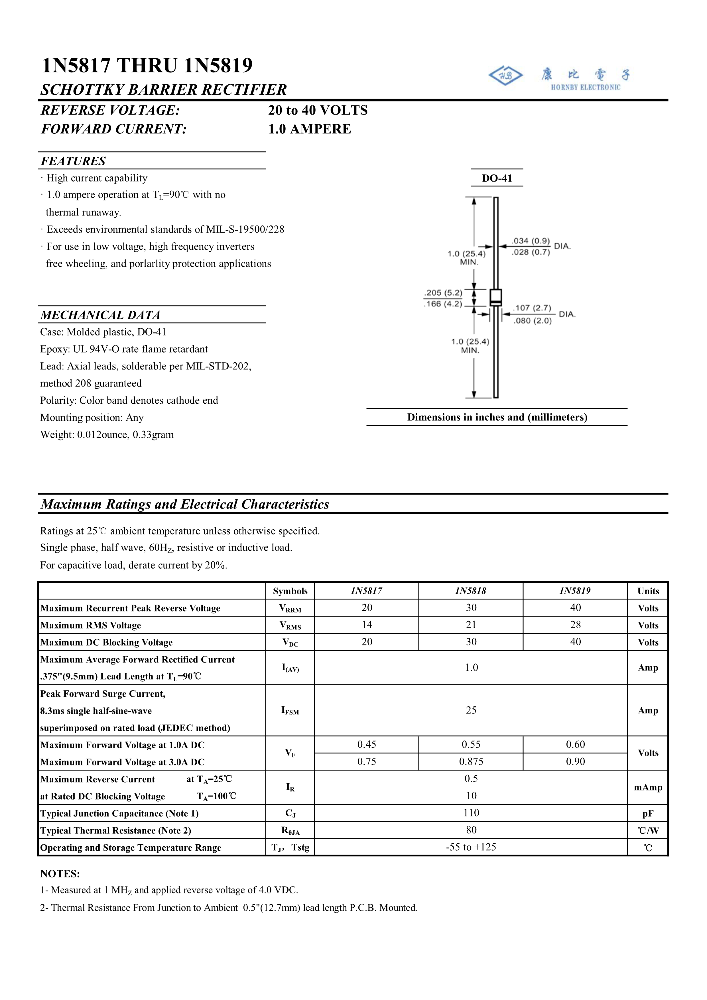 1N5819数据手册DO-41封装HORNBY ELECTRONIC(南通康比)PDF规格书,中英文