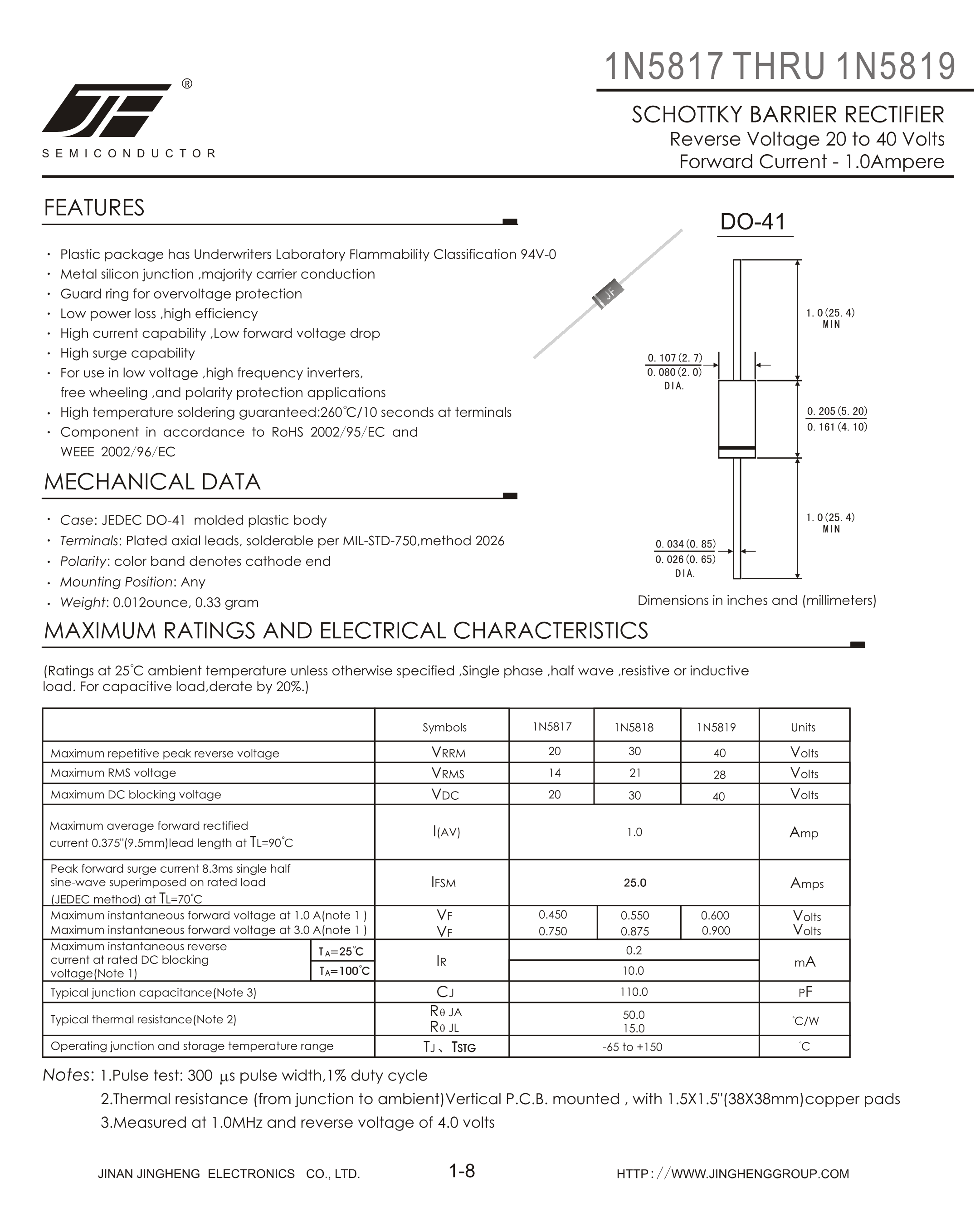 1N5819数据手册DO-41封装JF(吉福)PDF规格书,中英文下载