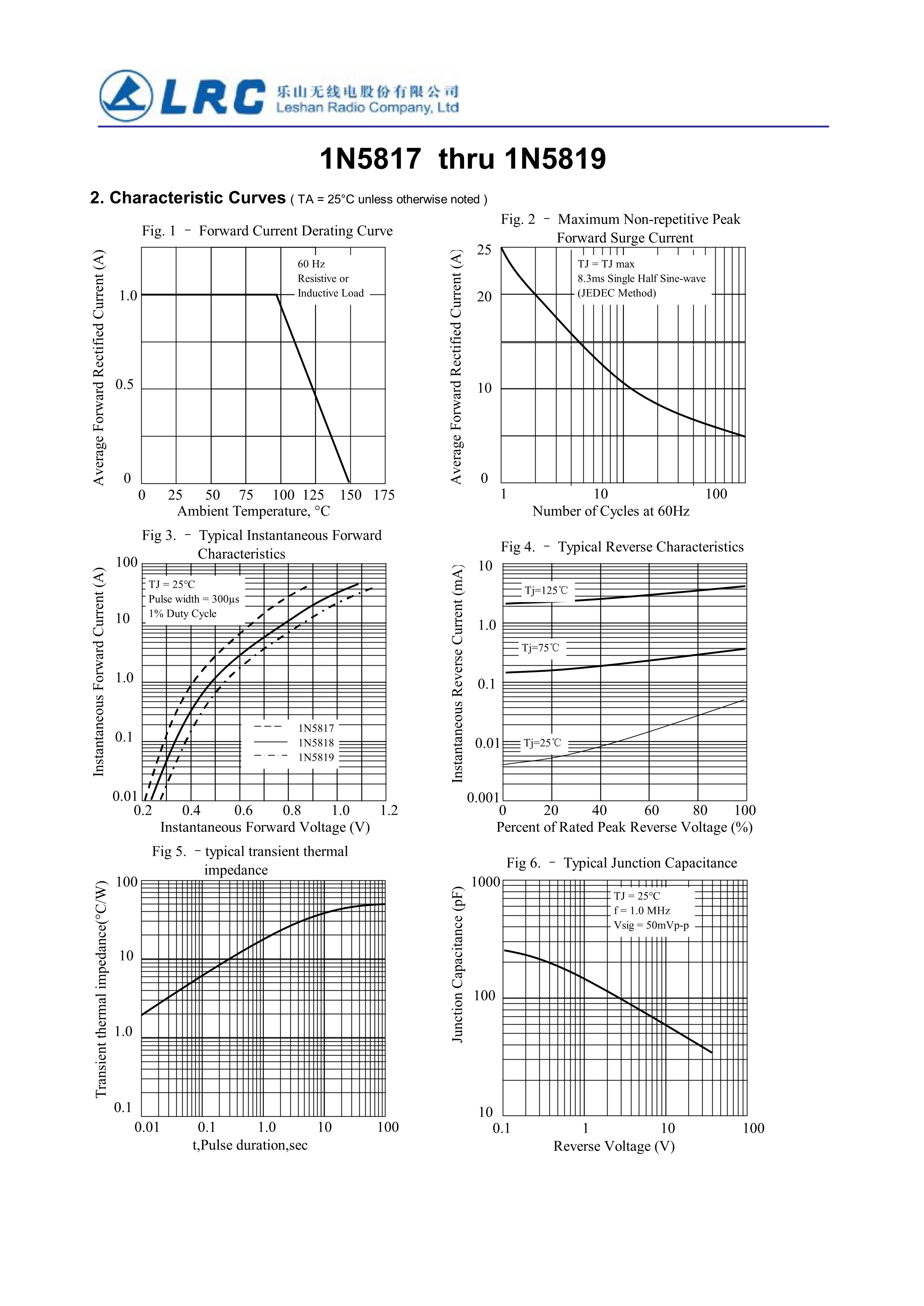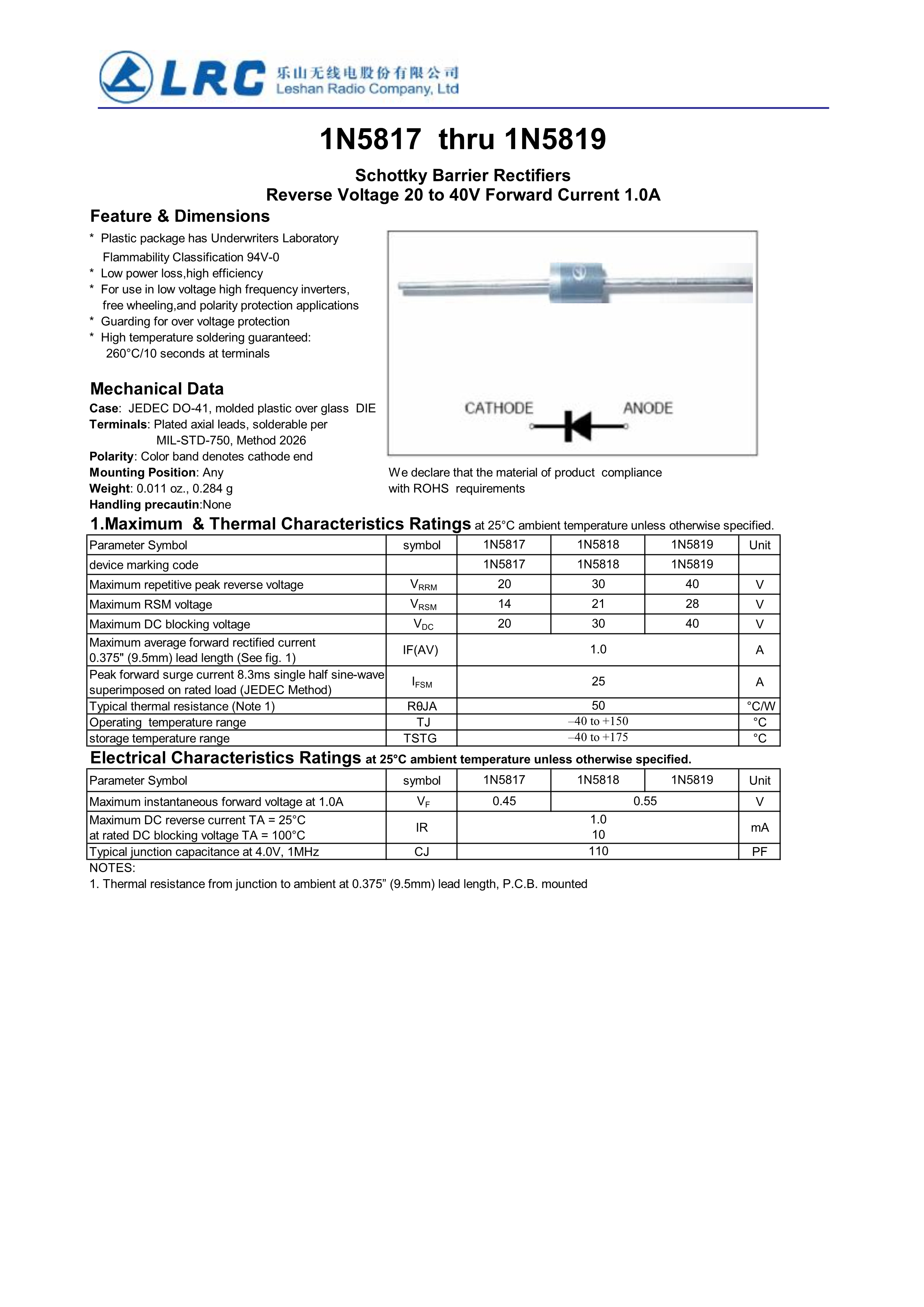 1N5819数据手册DO-41封装LRC(乐山无线电)PDF规格书,中英文下载
