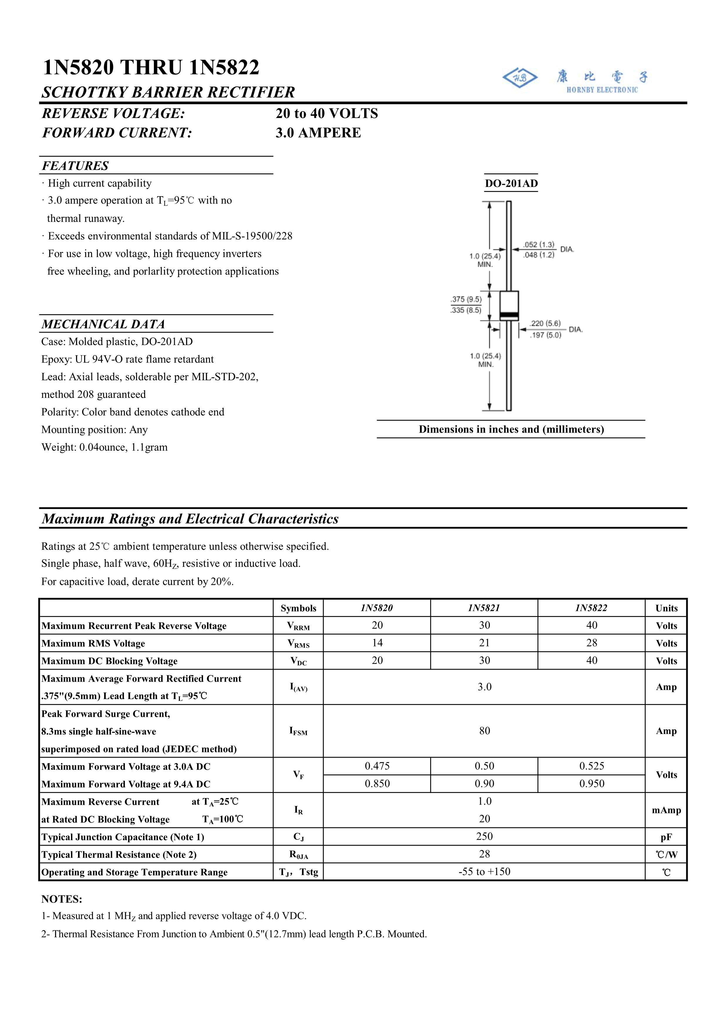 1N5822数据手册DO-201AD封装HORNBY ELECTRONIC(南通康比)PDF规格书,