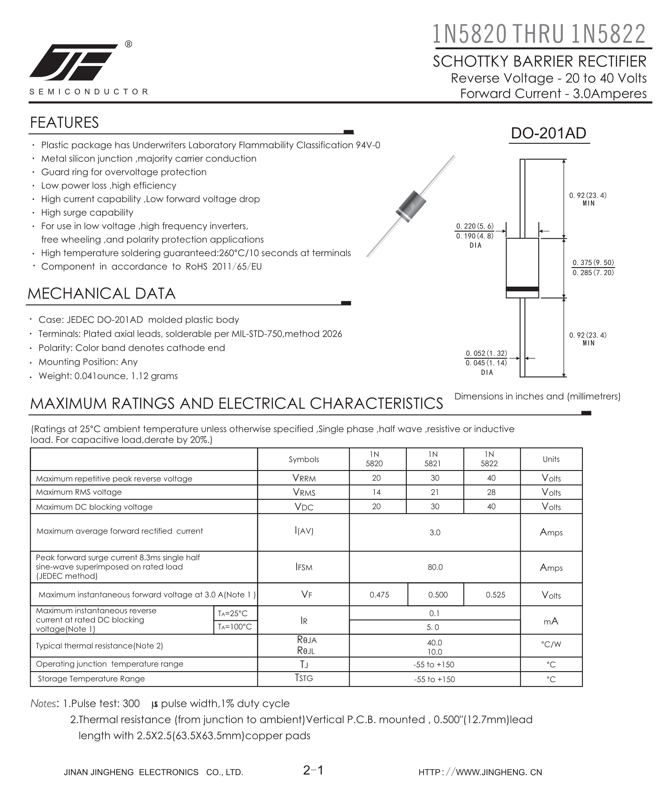 1N5822数据手册DO-201AD封装JH(晶恒)PDF规格书,中英文下载