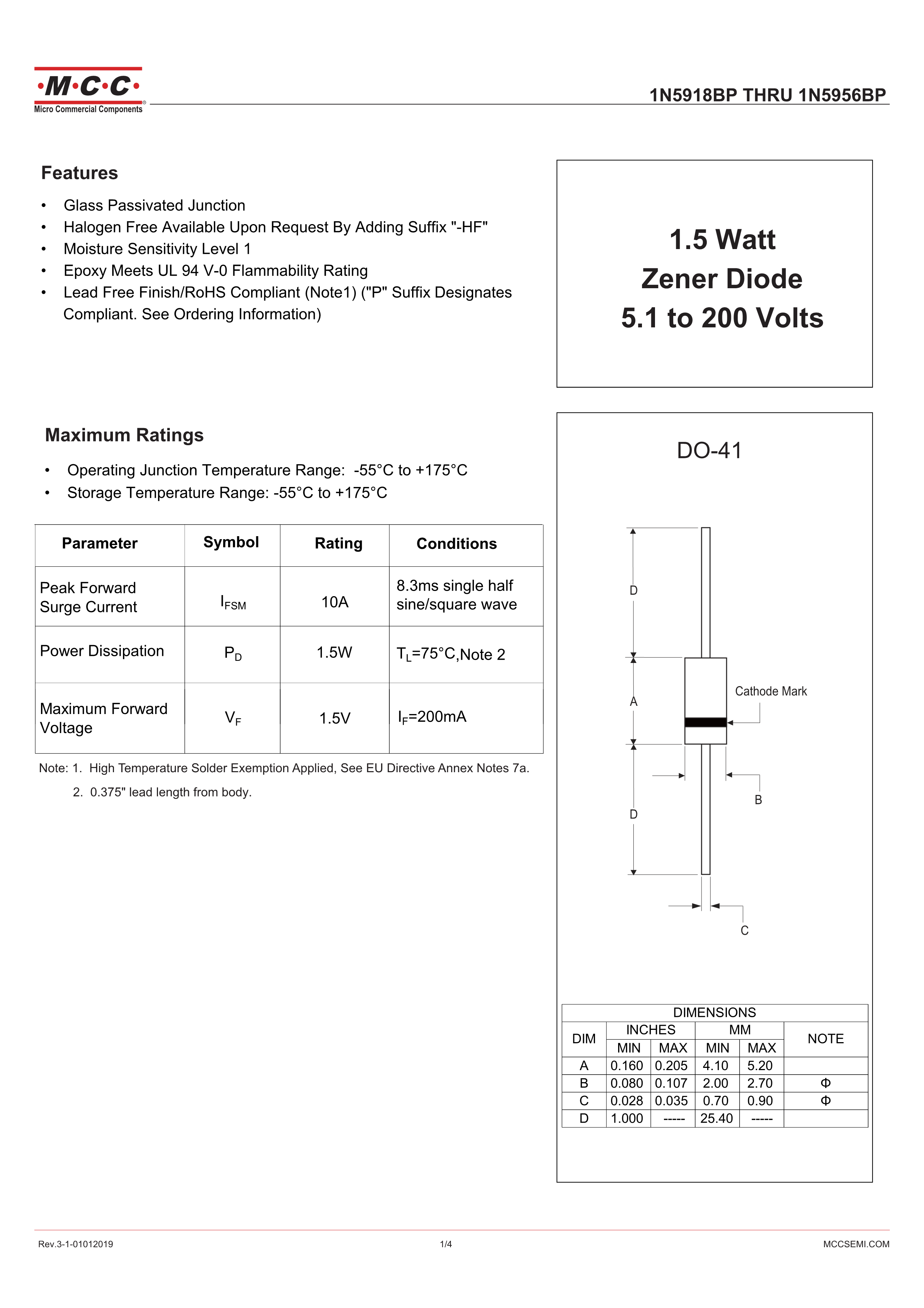 1N5934BP-BP数据手册DO-41封装MCC(美微科)PDF规格书,中英文下载