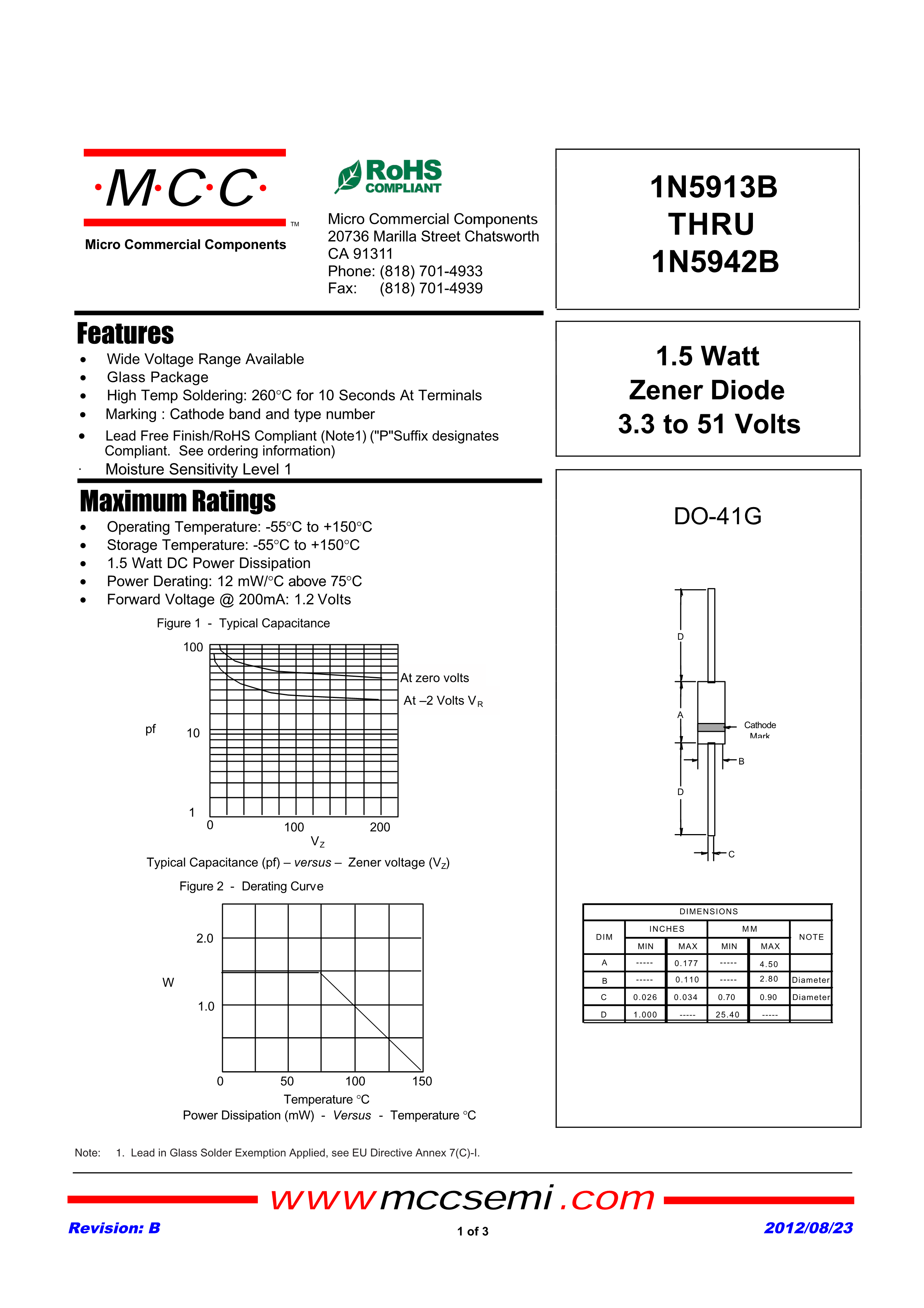 1N5940B-TP数据手册DO-41G封装MCC(美微科)PDF规格书,中英文下载