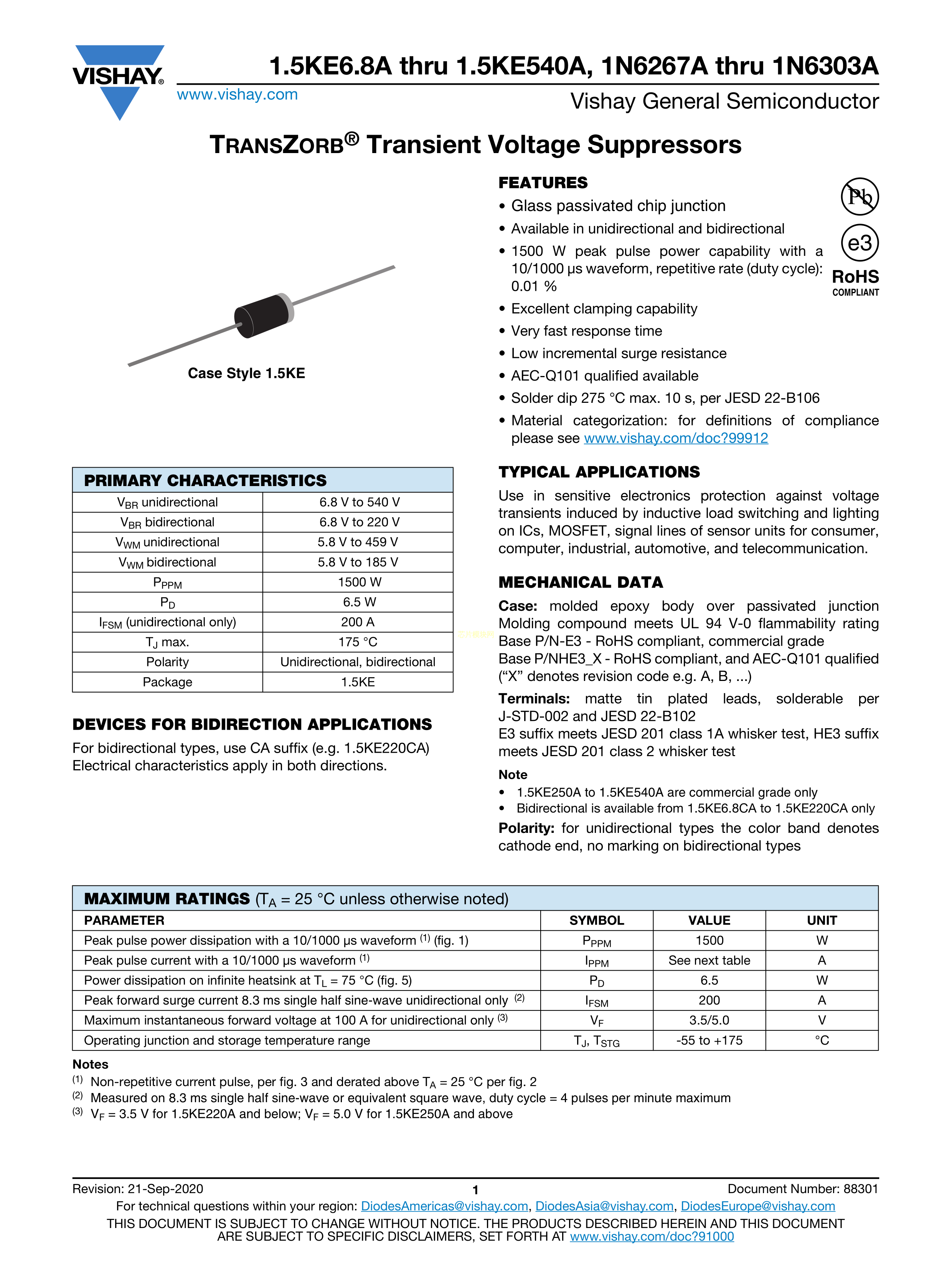 1N6291A-E3-73数据手册1.5KE封装VISHAY(威世)PDF规格书,中英文下载