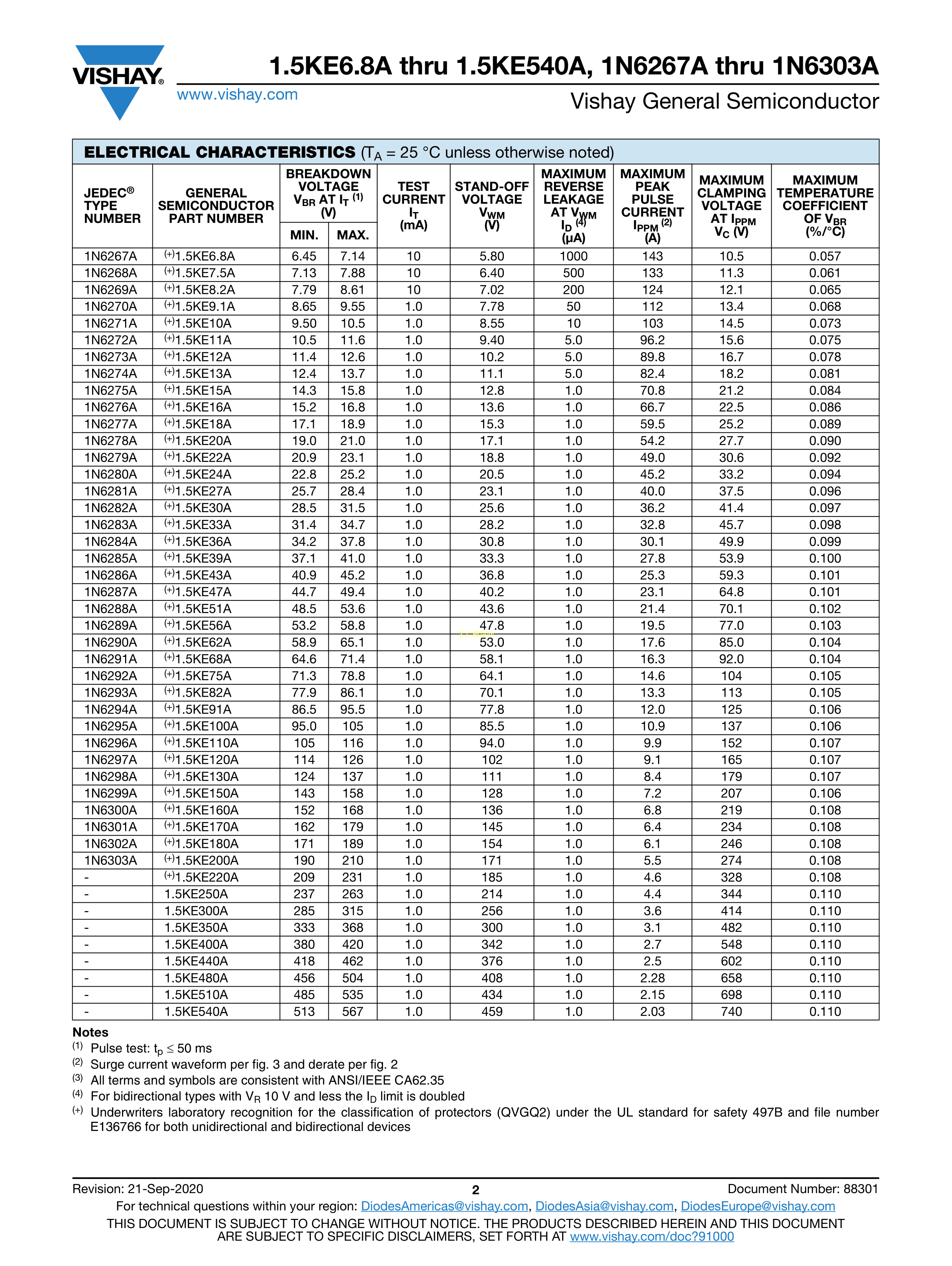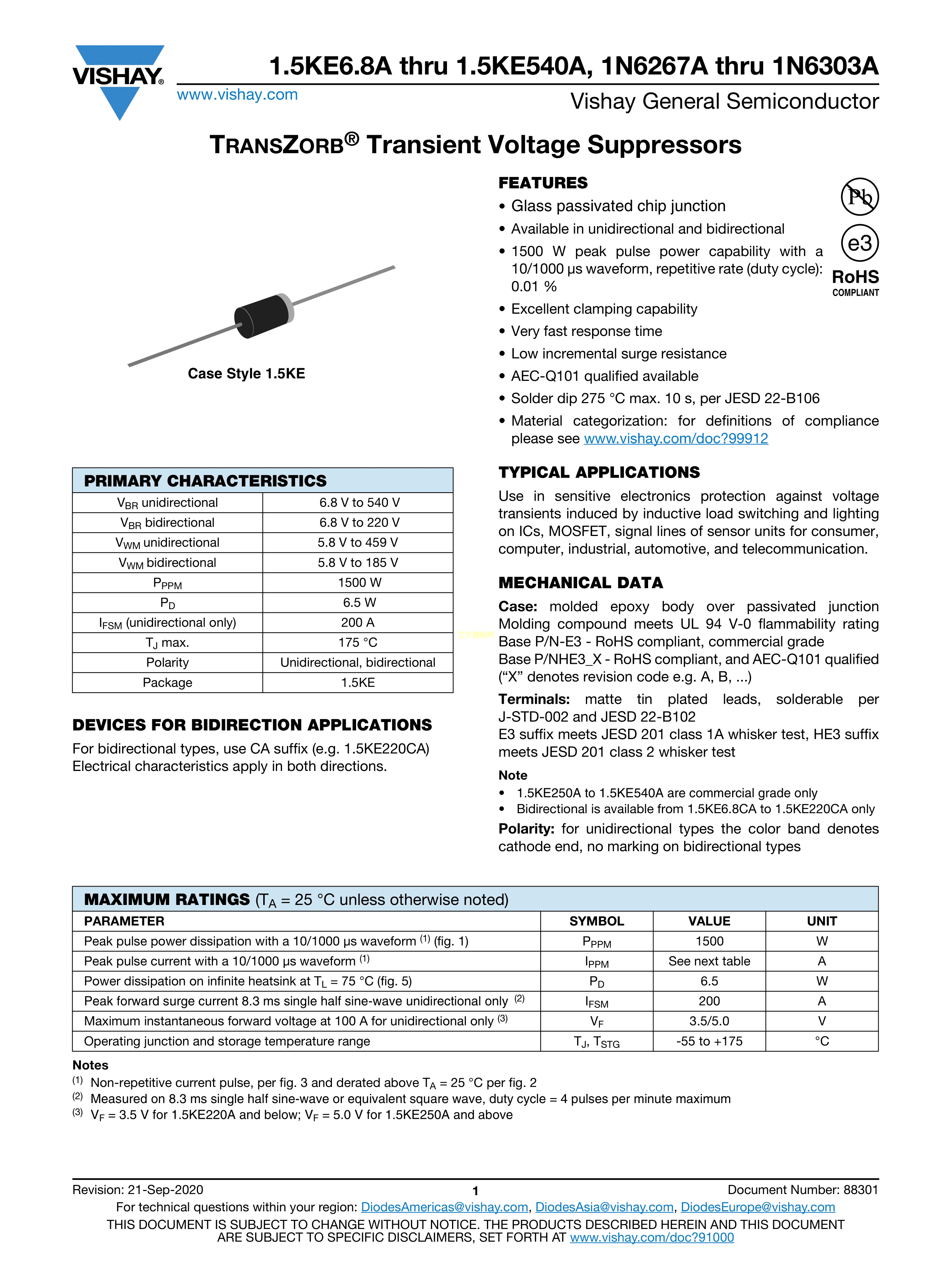 1N6296A-E3-51数据手册1.5KE封装VISHAY(威世)PDF规格书,中英文下载