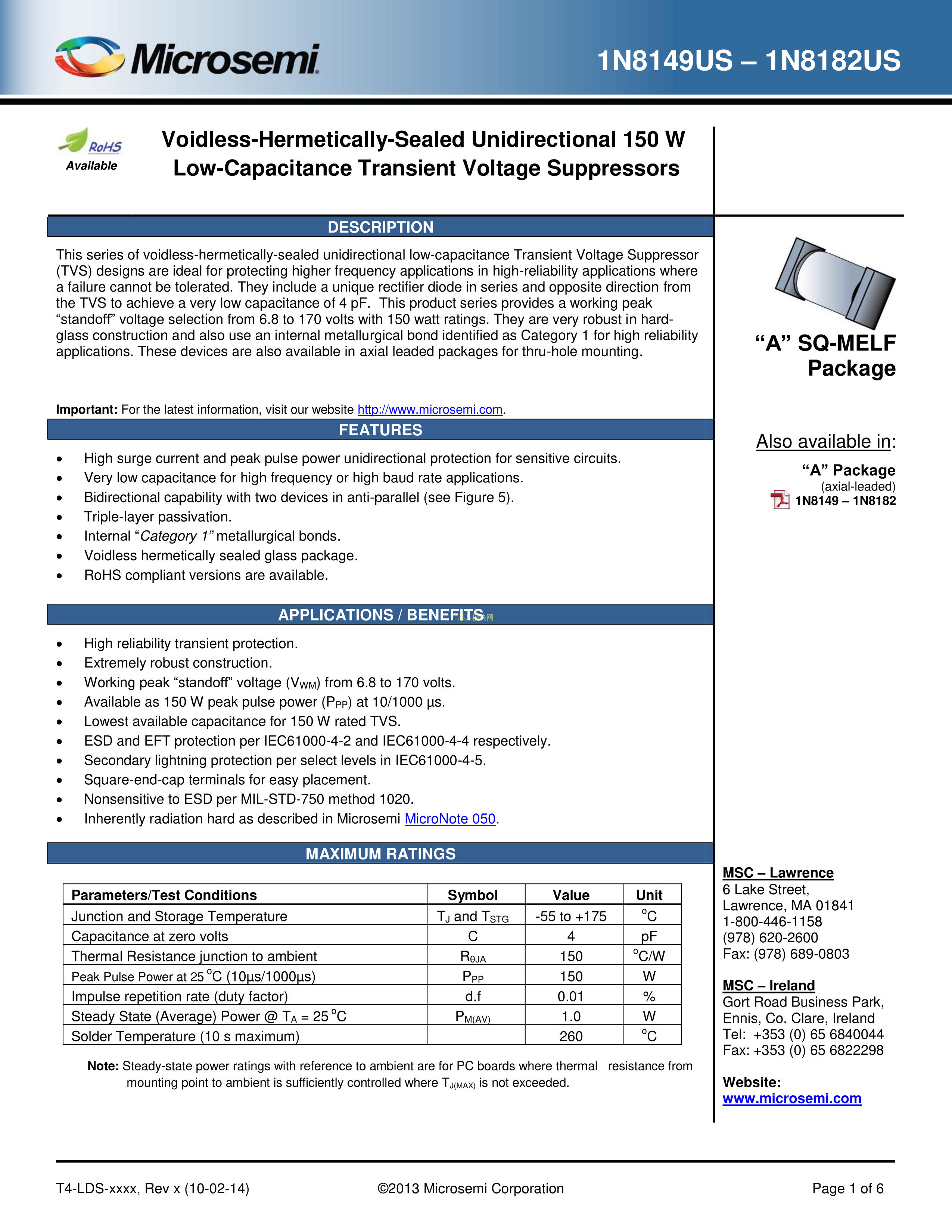 1N8160US数据手册-封装Microsemi(美高森美)PDF规格书,中英文下载
