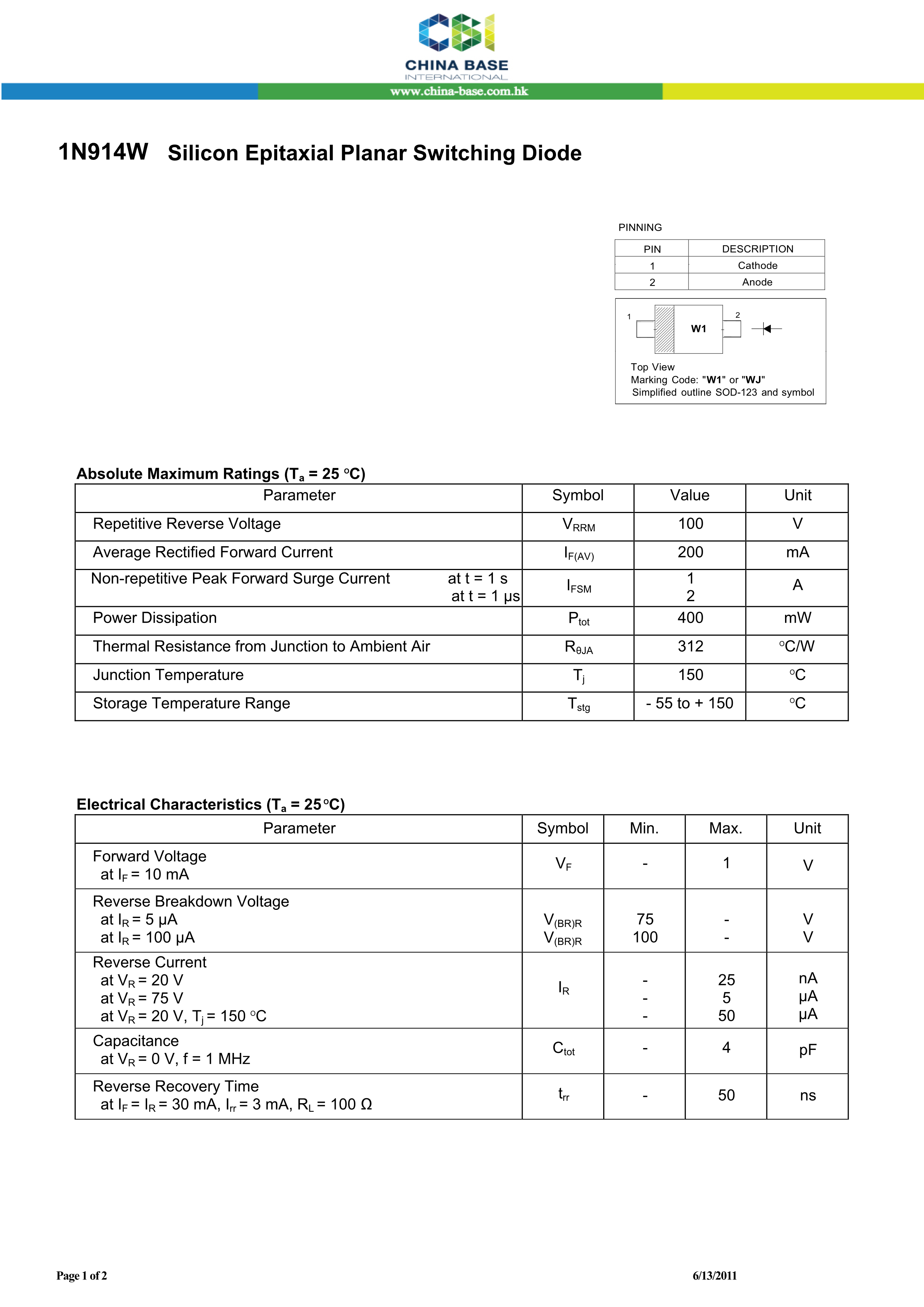 1N914W T4数据手册SOD-123封装CBI(创基)PDF规格书,中英文下载