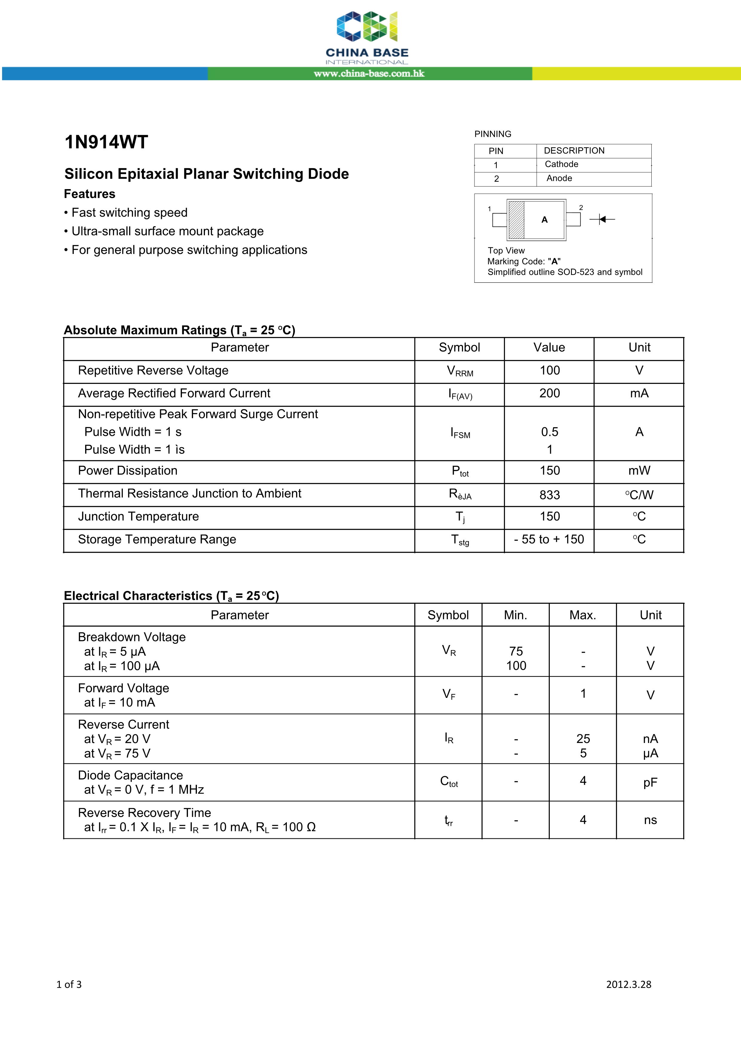 1N914WT T4数据手册SOD-523封装CBI(创基)PDF规格书,中英文下载