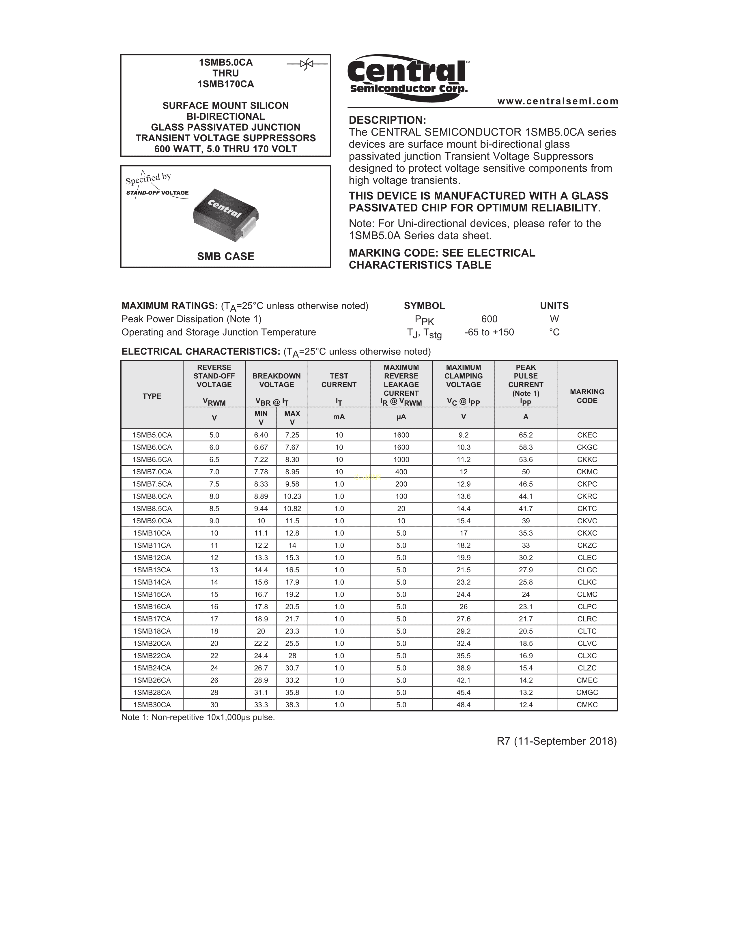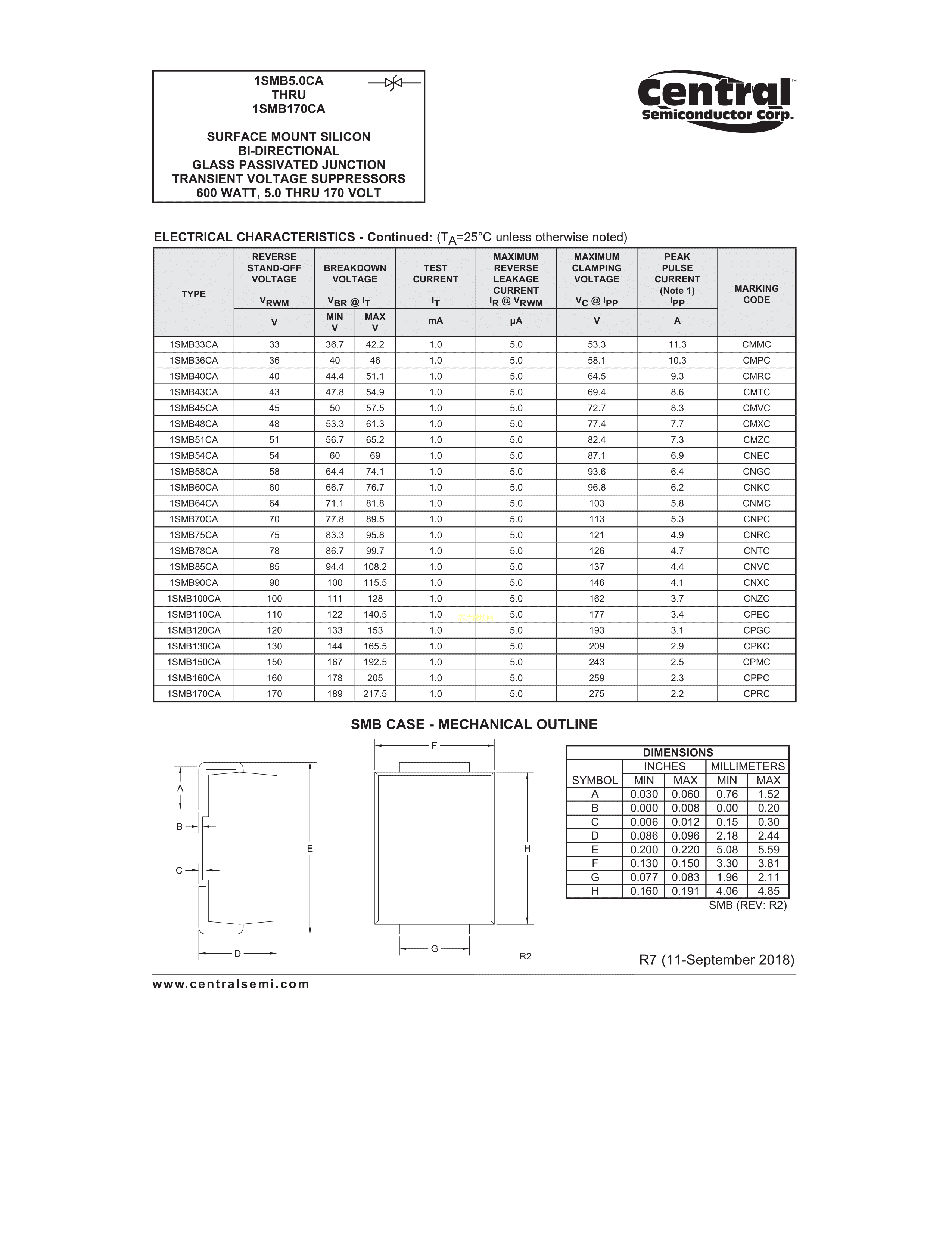 1SMB130CA TR13 PBFREE数据手册SMB封装Central(中环)PDF规格书,中英