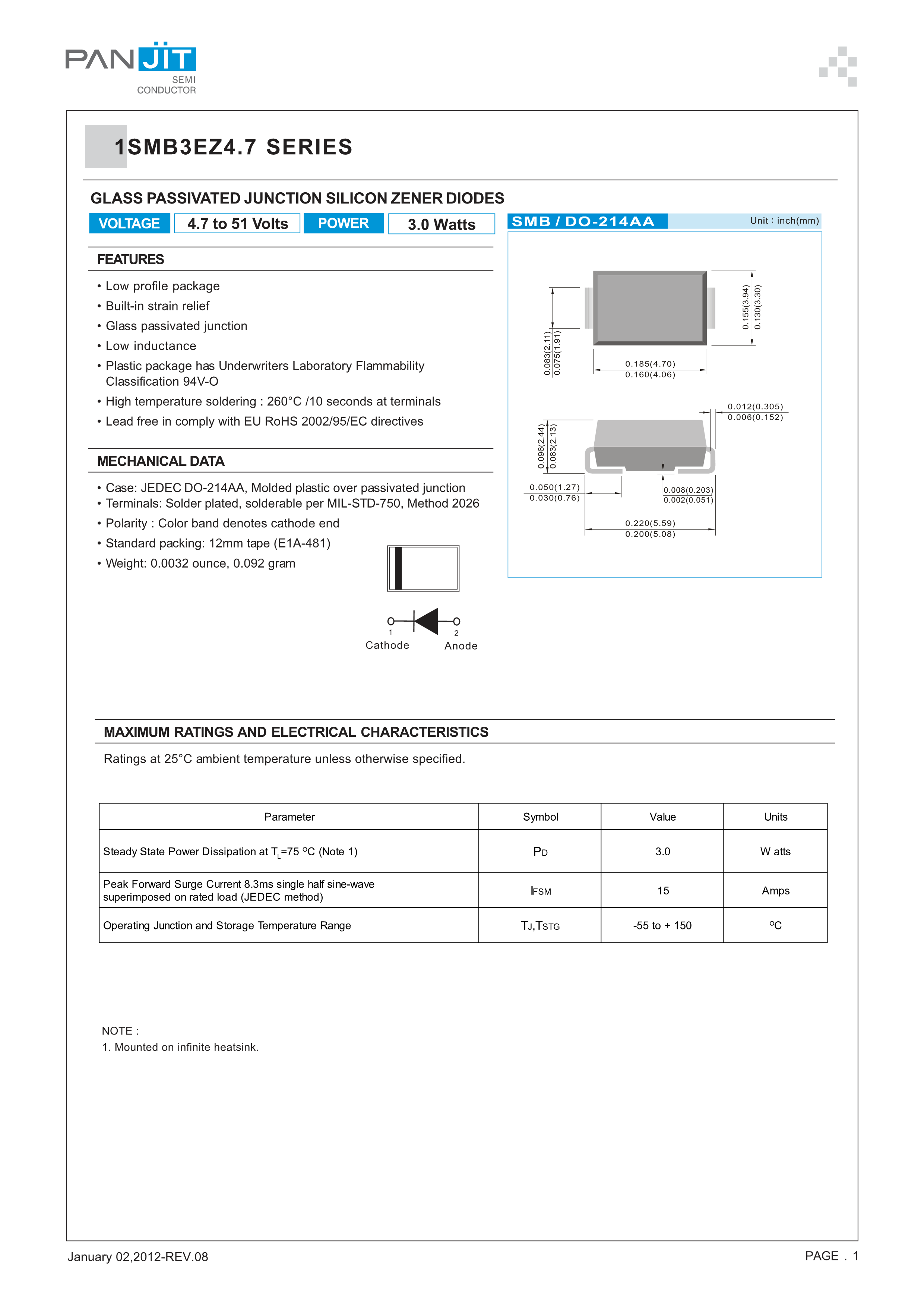 1SMB3EZ4.7_R1_00001数据手册SMB(DO-214AA)封装PANJIT(强茂)PD