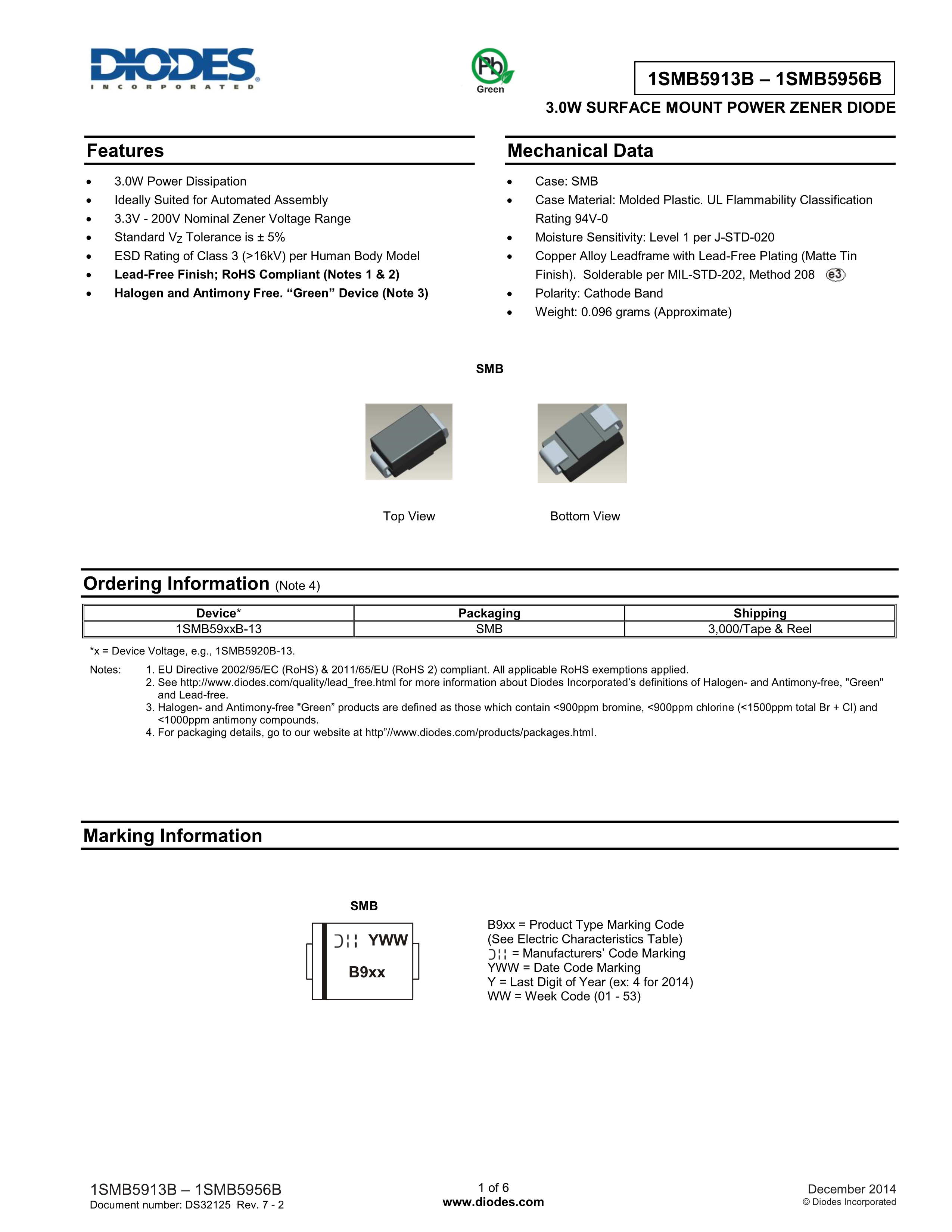 1SMB5931B-13数据手册SMB(DO-214AA)封装DIODES(美台)PDF规格书,中英