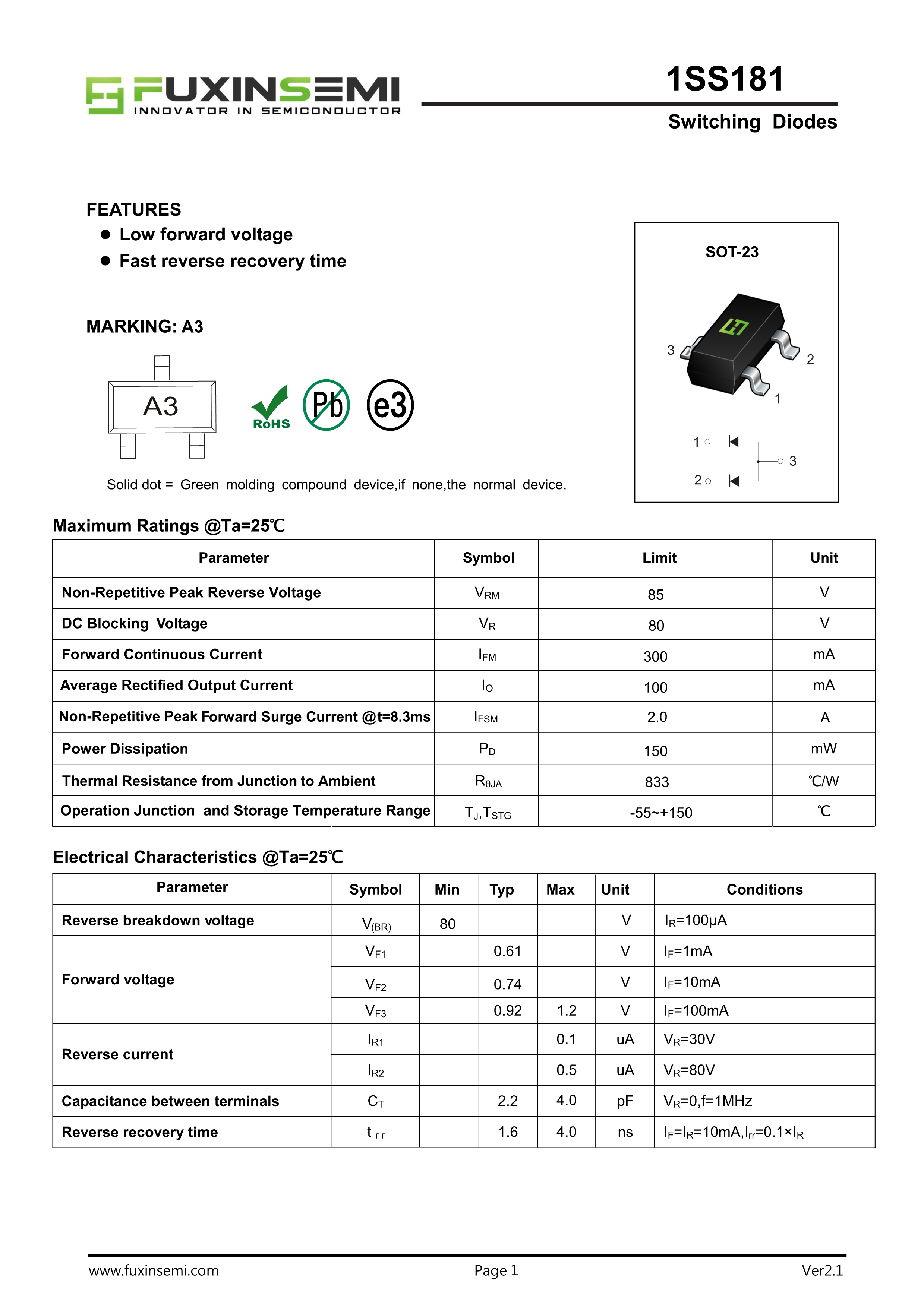 1SS181数据手册SOT-23封装FUXINSEMI(富芯森美)PDF规格书,中英文下载