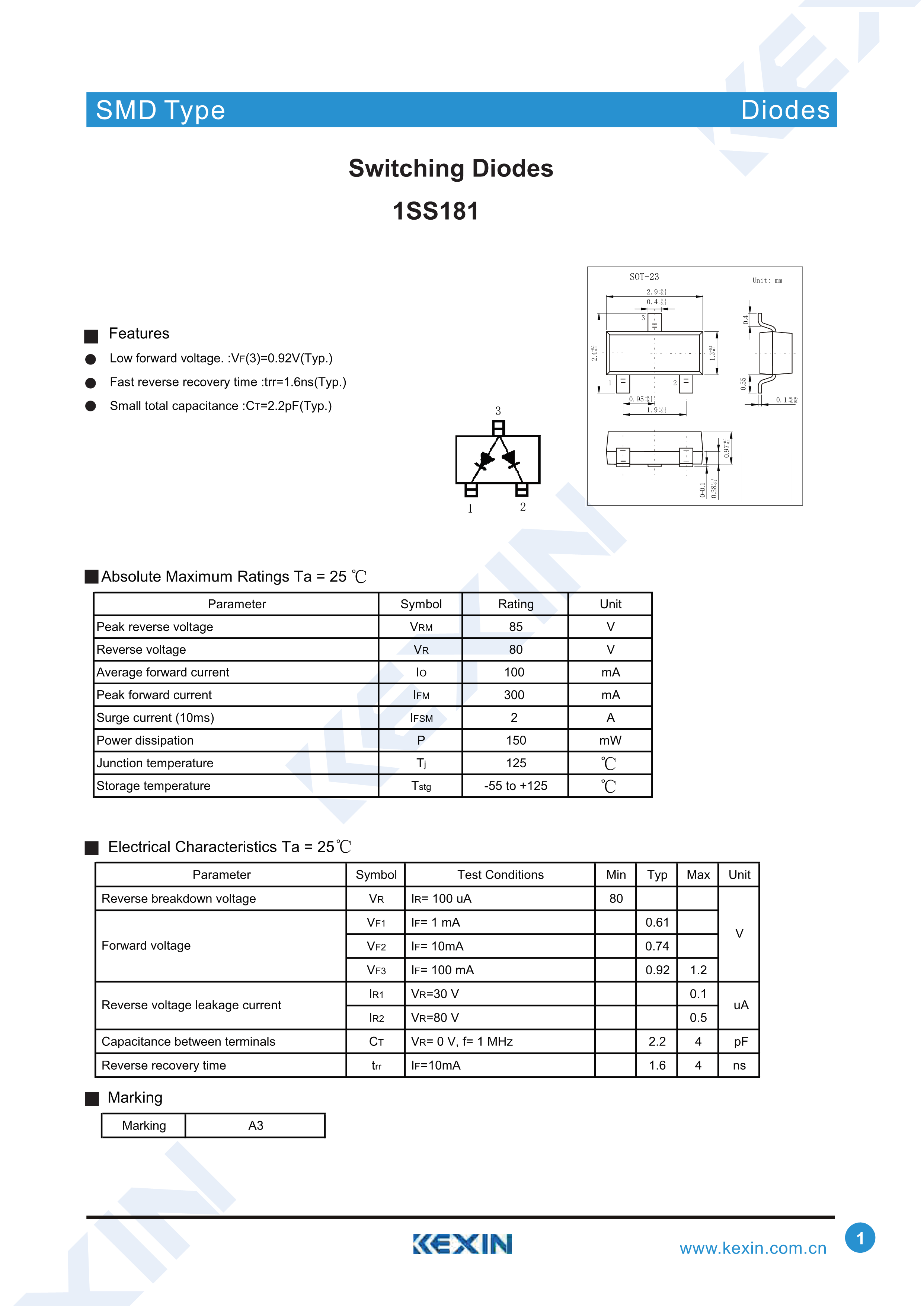 1SS181数据手册SOT-23封装KEXIN(科信)PDF规格书,中英文下载