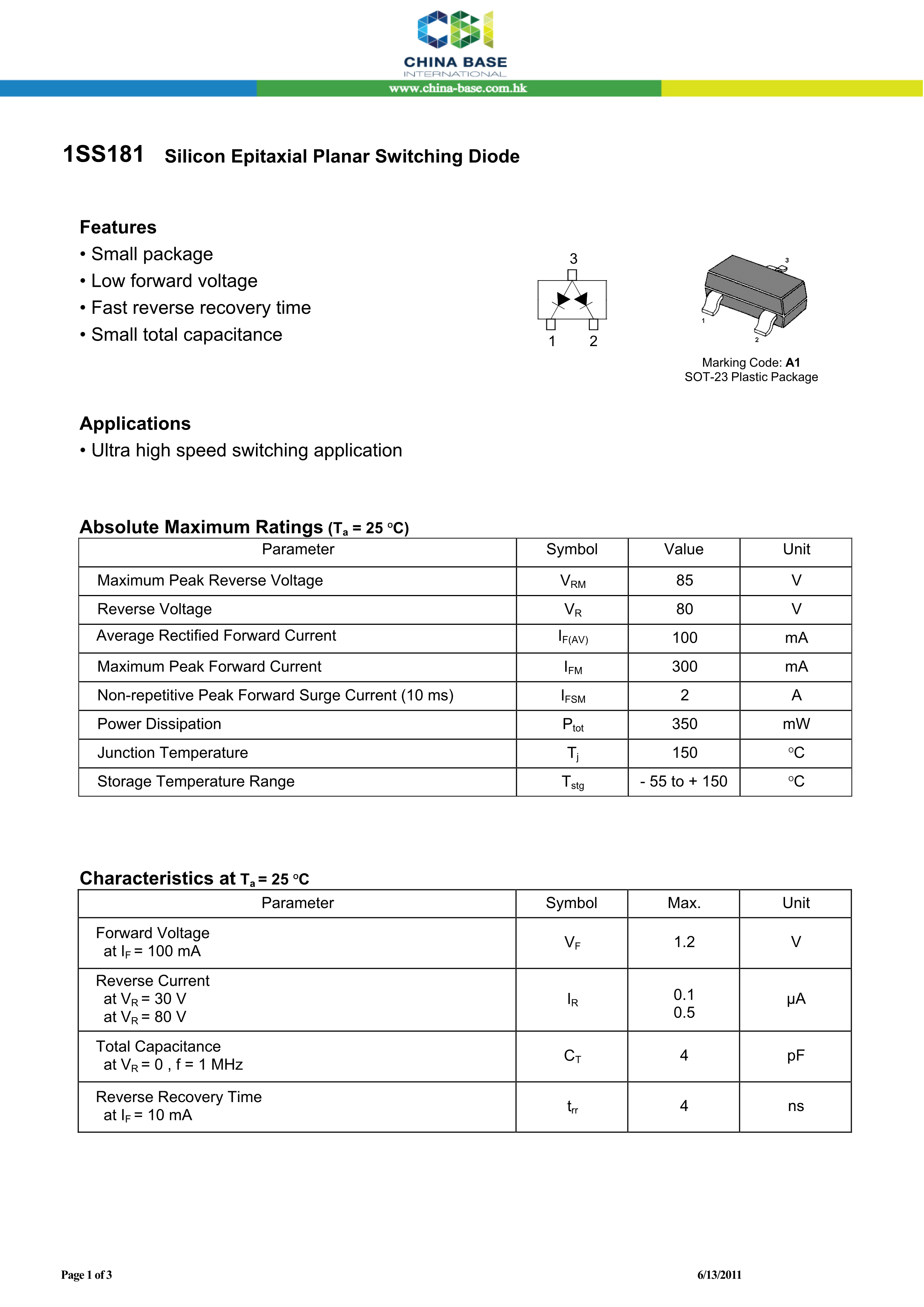 1SS181 A3数据手册SOT-23封装CBI(创基)PDF规格书,中英文下载