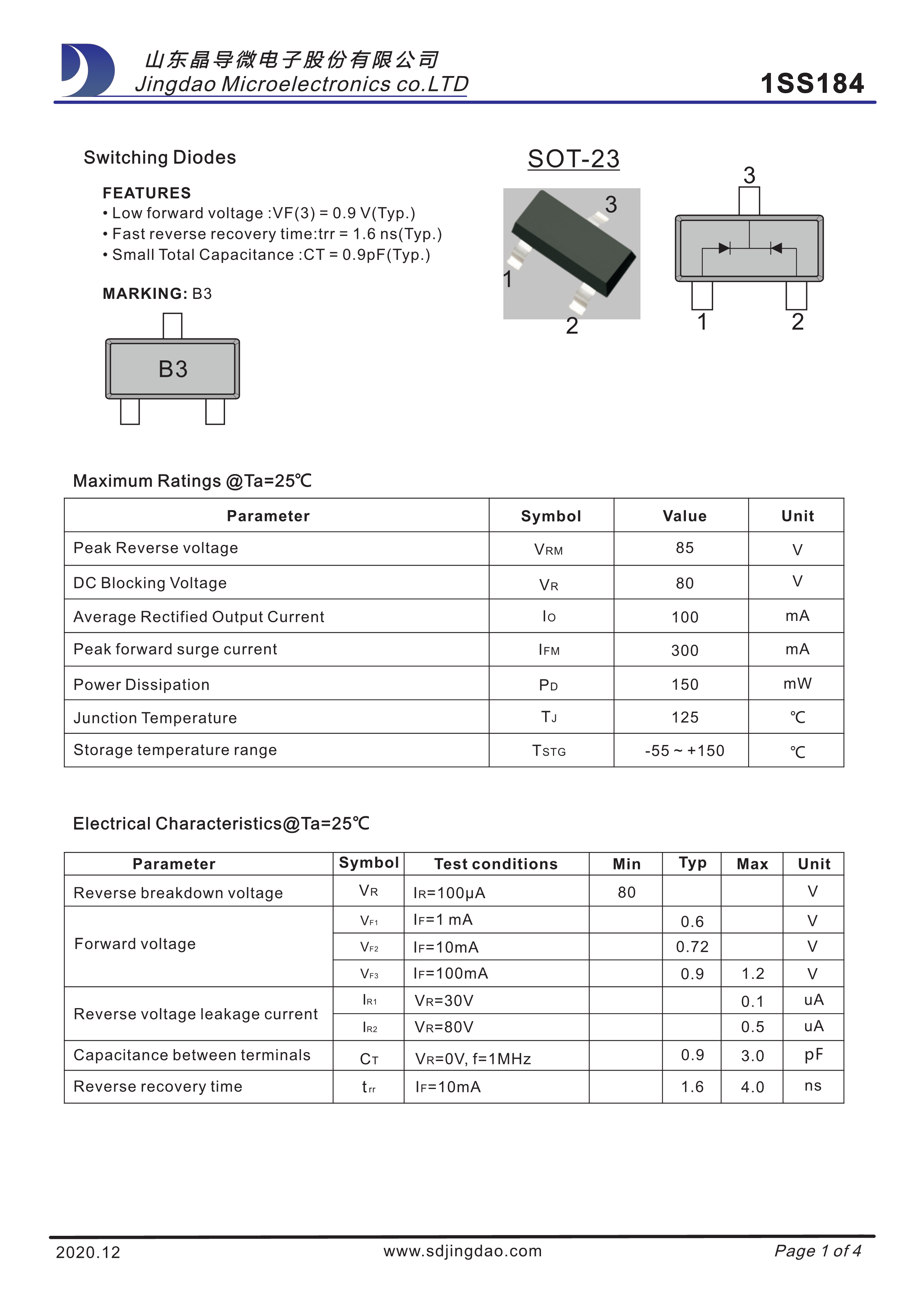 1SS184数据手册SOT-23封装晶导微电子PDF规格书,中英文下载