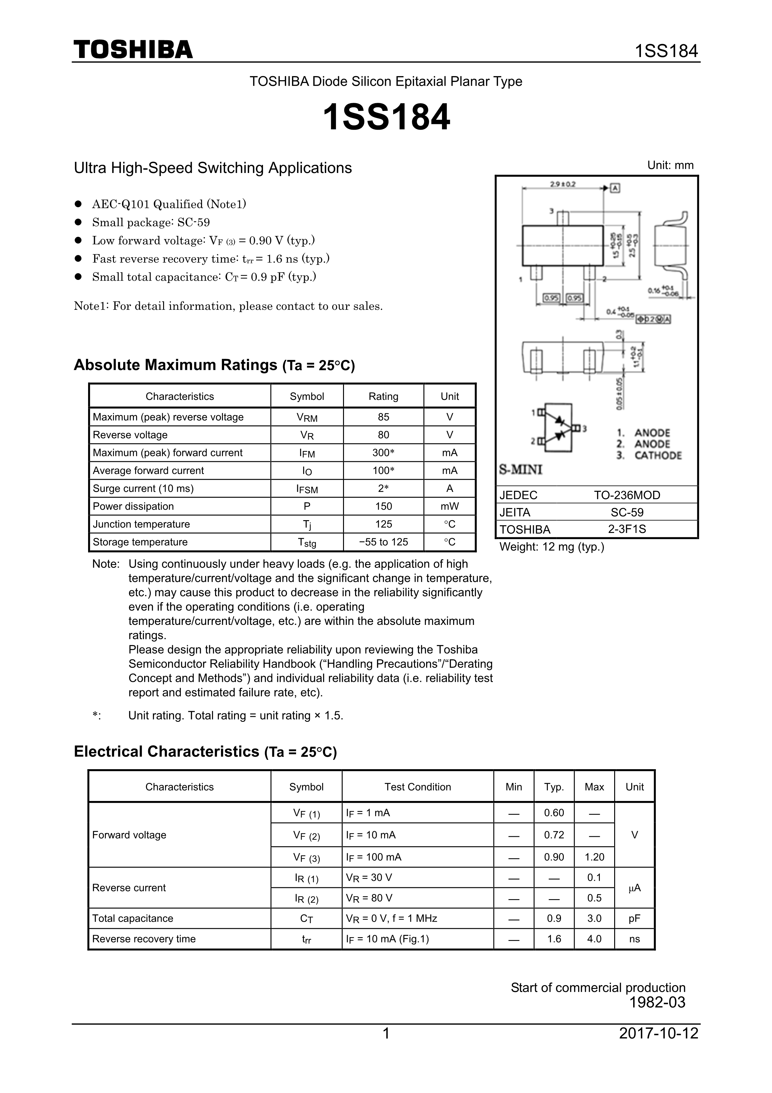 1SS184LF数据手册SC-59封装TOSHIBA(东芝)PDF规格书,中英文下载