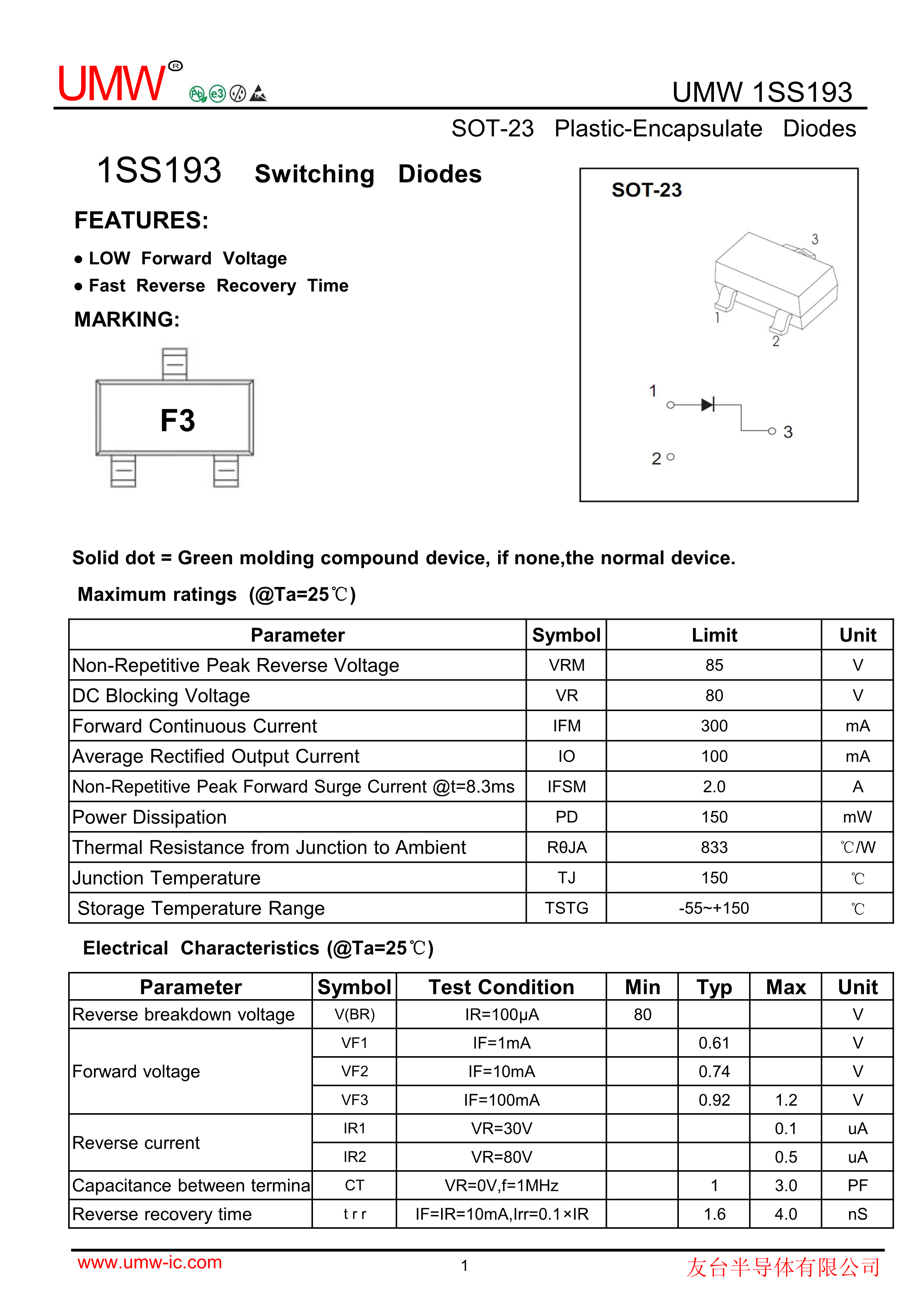 1SS193数据手册SOT-23封装UMW(友台半导体)PDF规格书,中英文下载