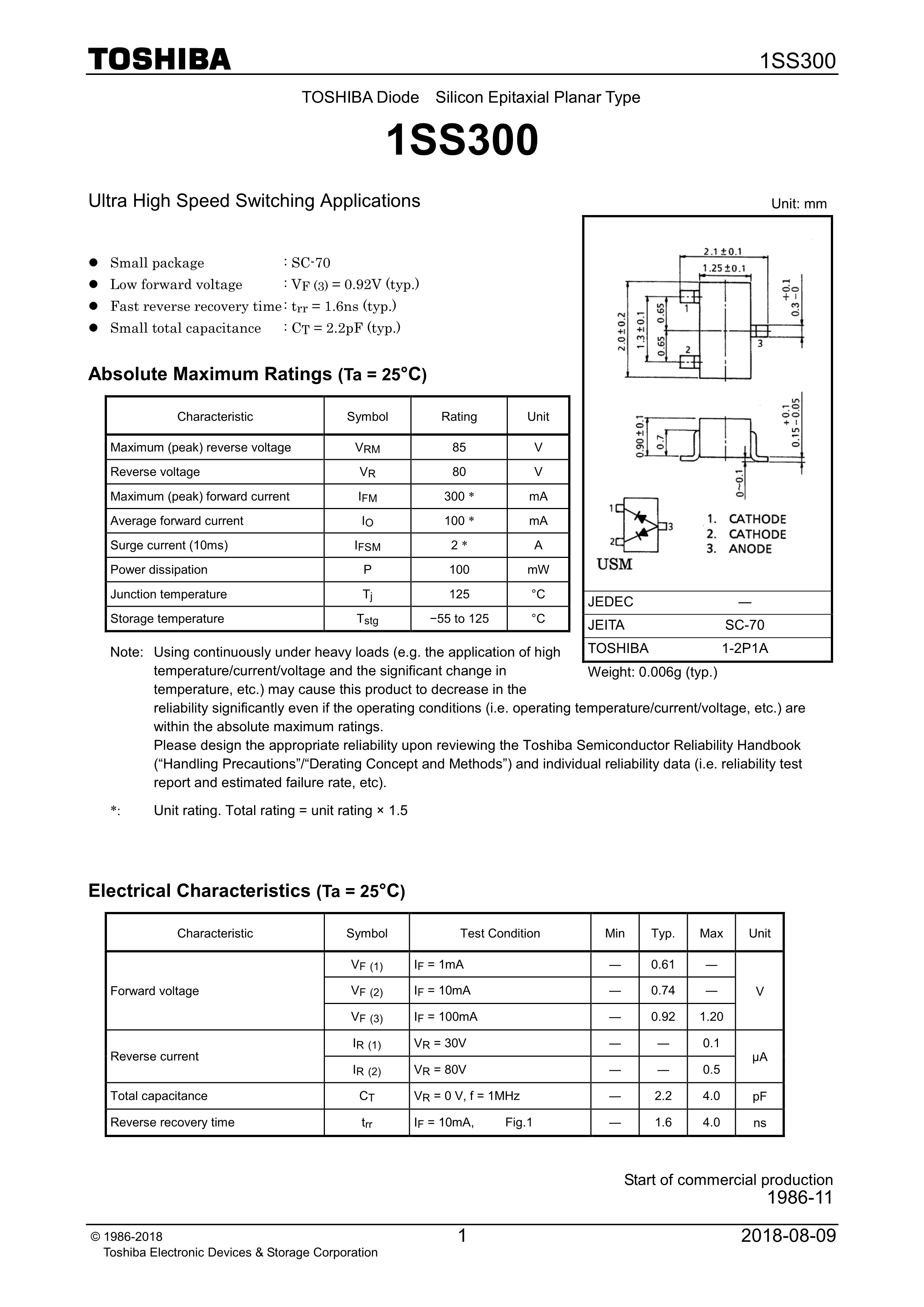 1SS300LF(T数据手册SOT-323封装TOSHIBA(东芝)PDF规格书,中英文下载