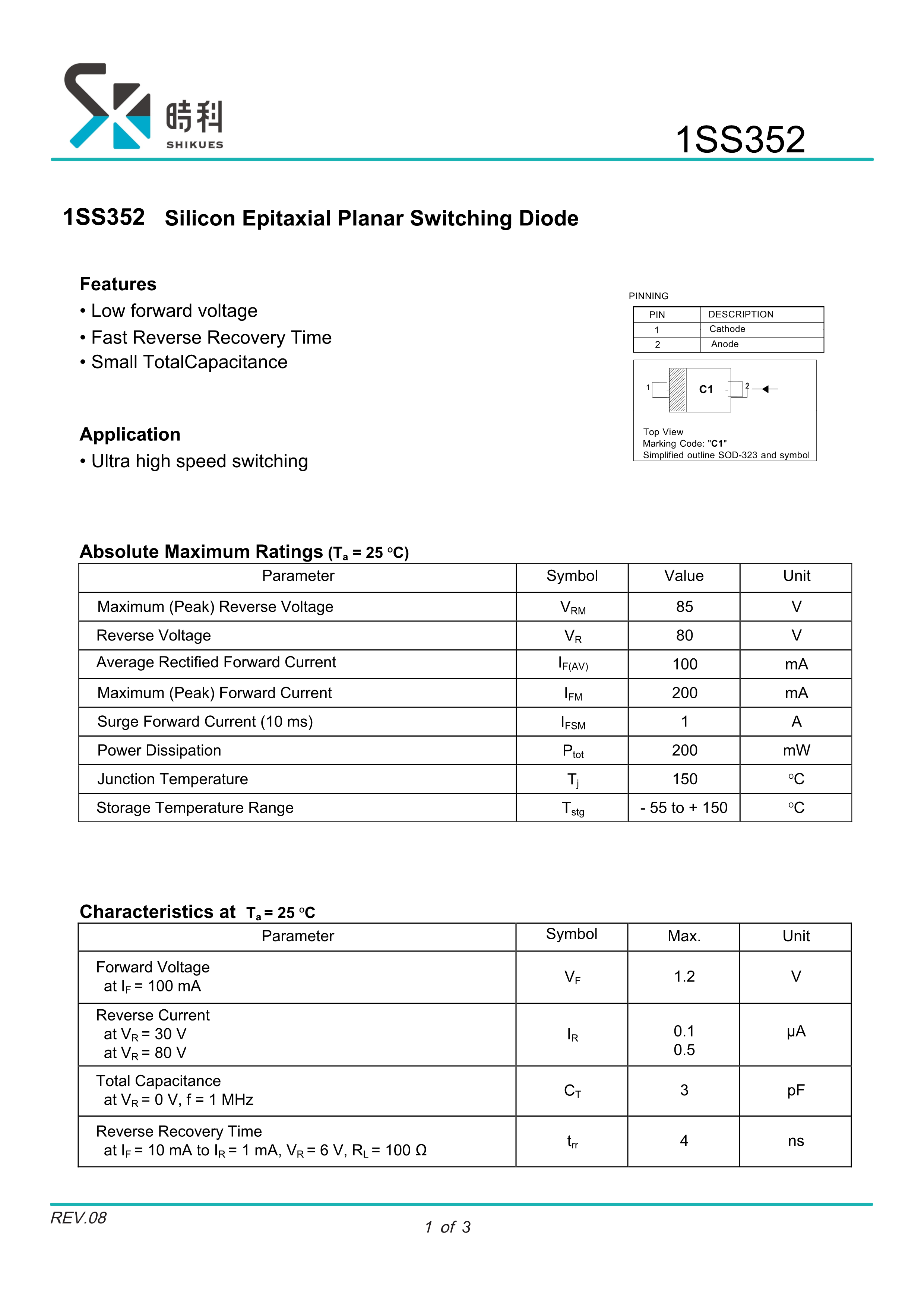 1SS352数据手册SOD-323封装SHIKUES(时科)PDF规格书,中英文下载