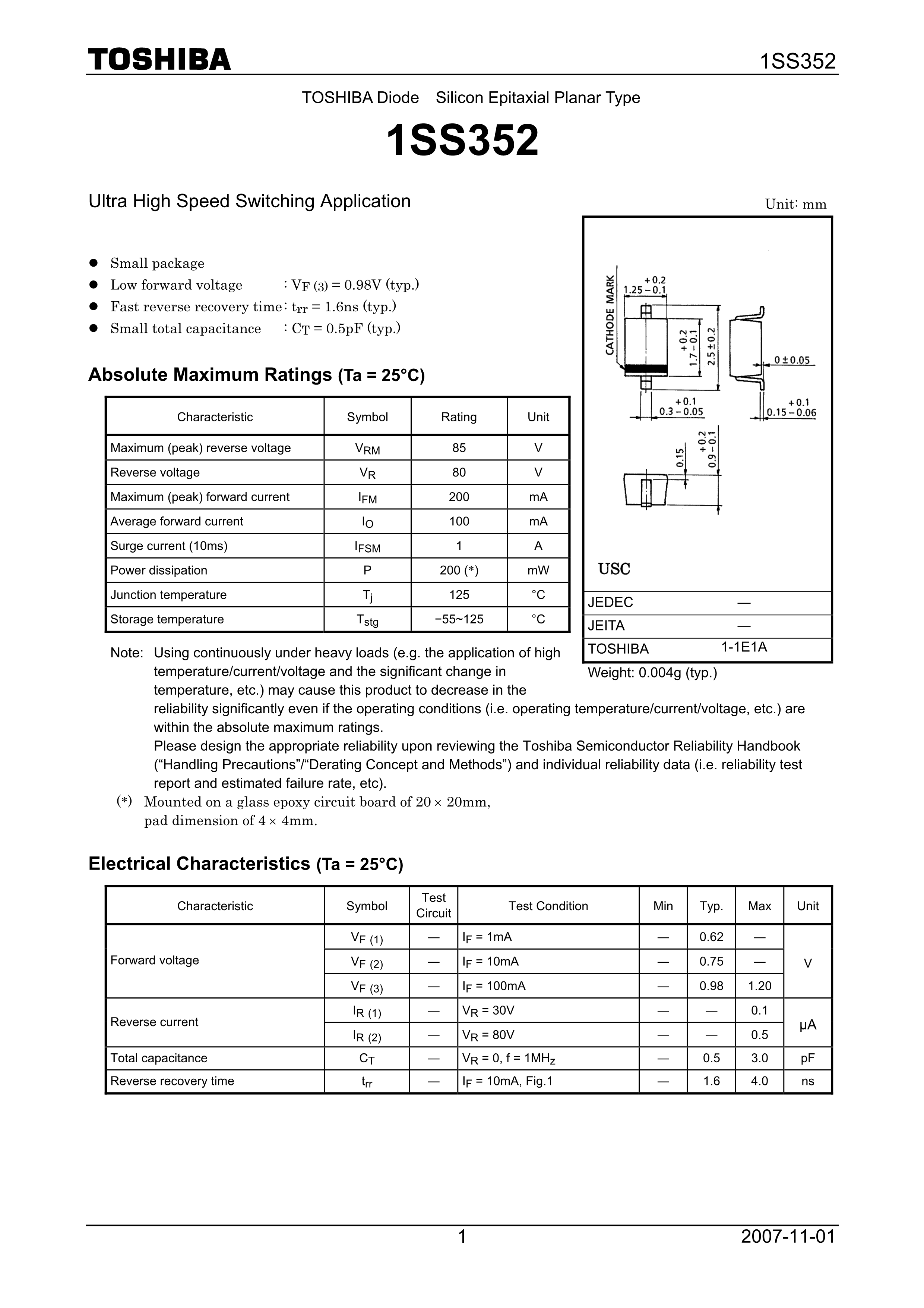 1SS352H3F数据手册SOD-323封装TOSHIBA(东芝)PDF规格书,中英文下载