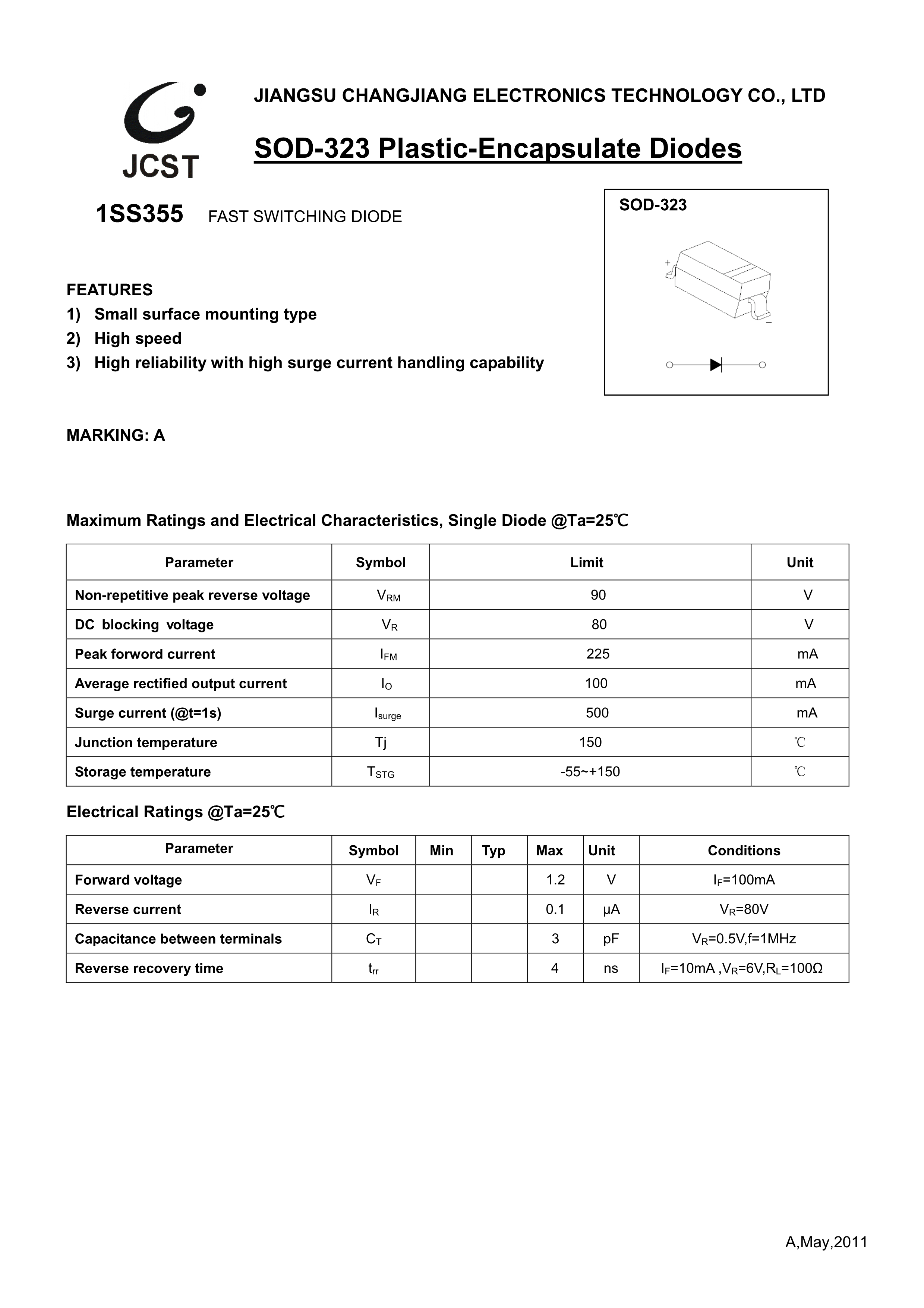 1SS355数据手册SOD-323封装CJ(江苏长电-长晶)PDF规格书,中英文下载