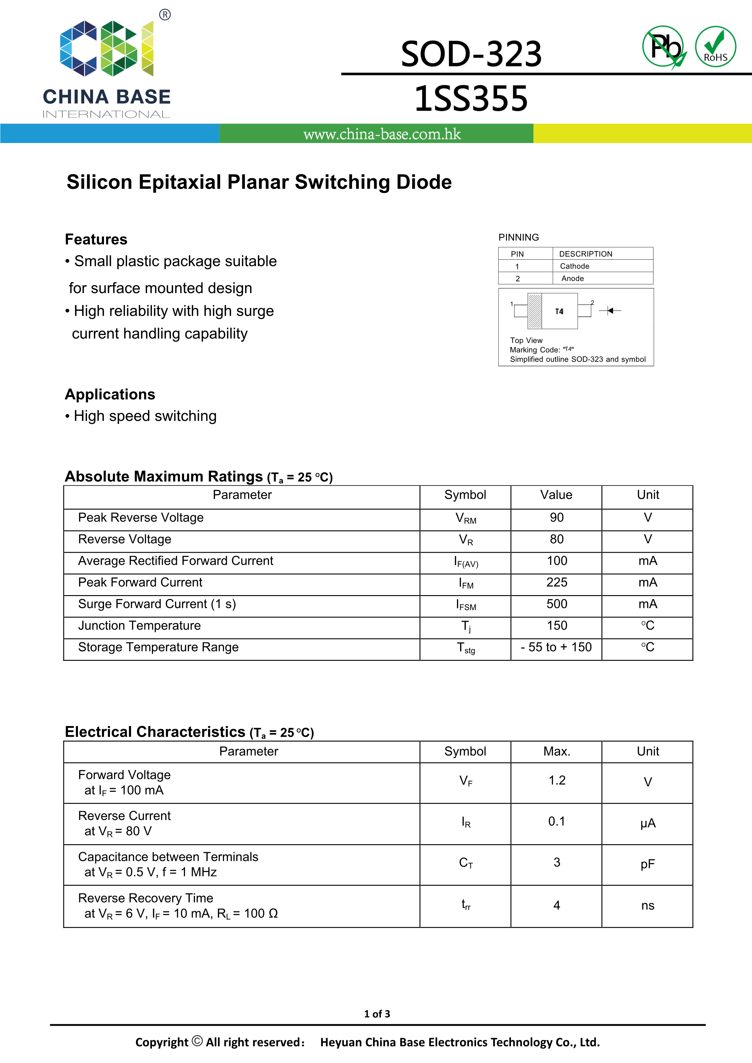 1SS355 T4数据手册SOD-323封装CBI(创基)PDF规格书,中英文下载