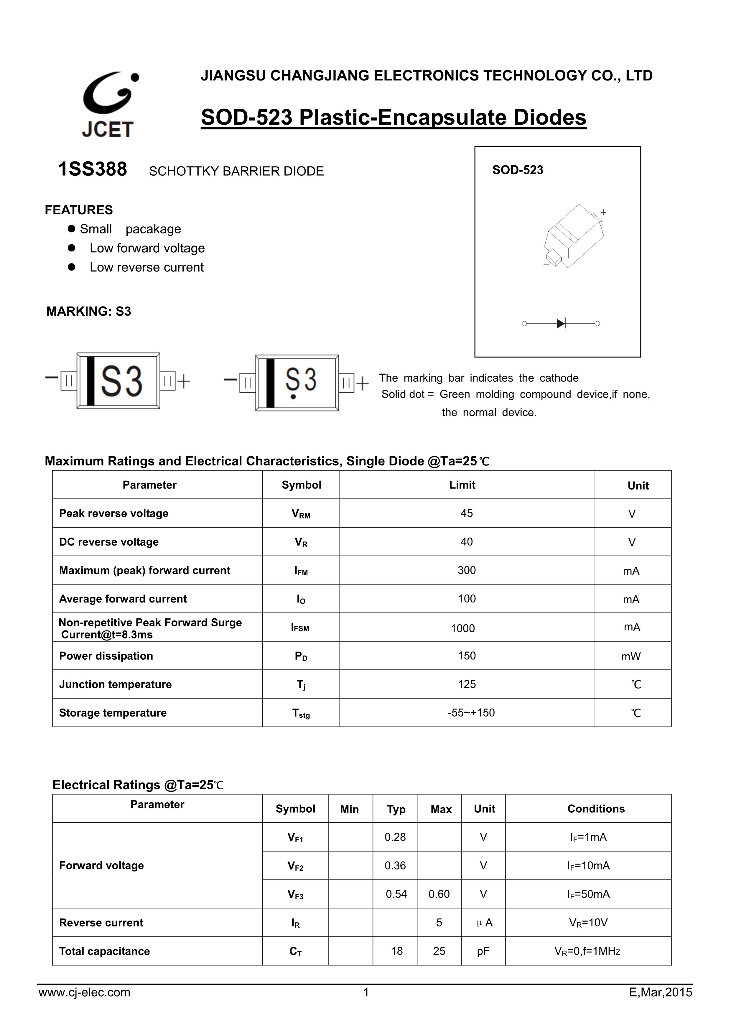 1SS388数据手册SOD-523封装CJ(江苏长电-长晶)PDF规格书,中英文下载