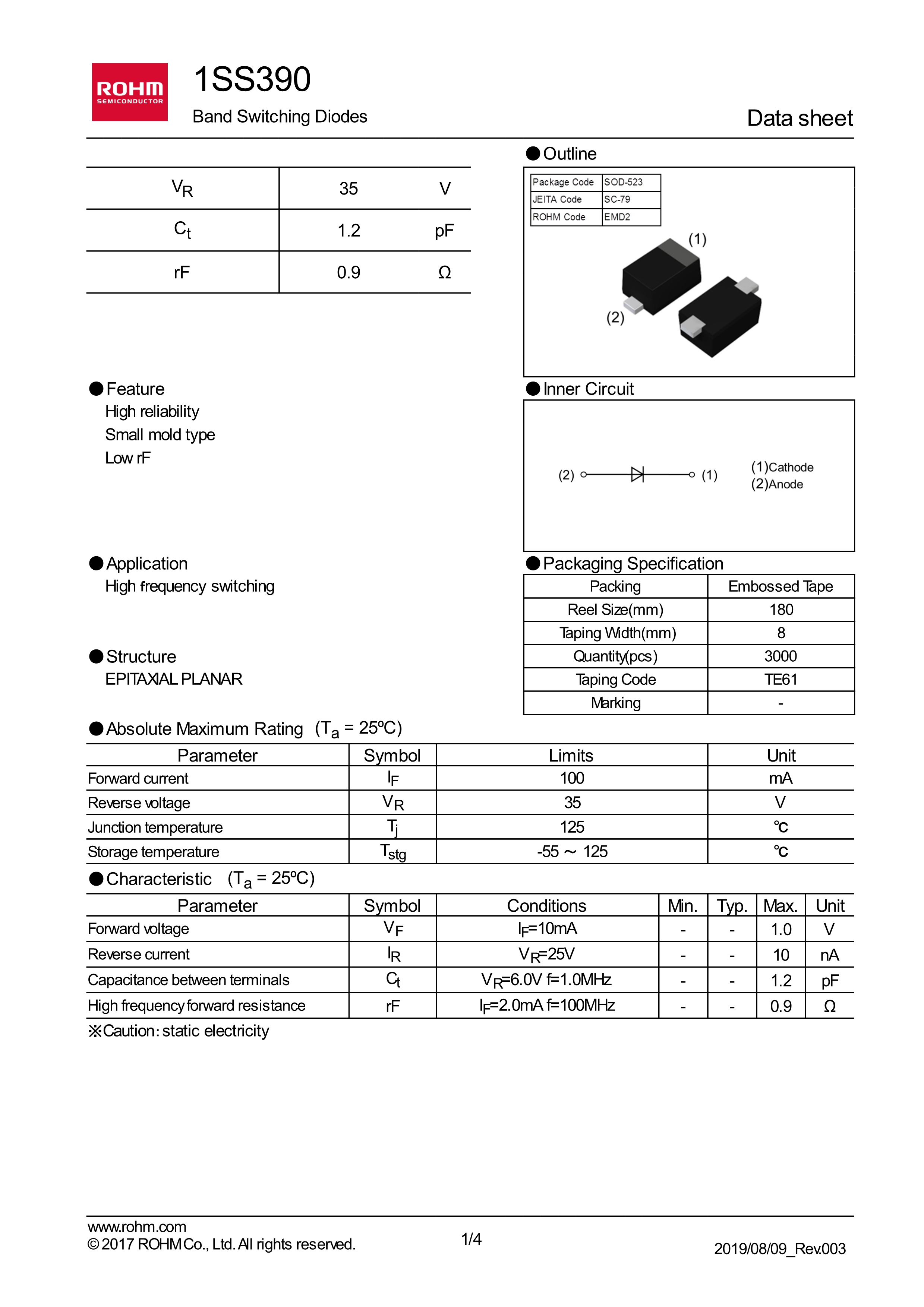 1SS390TE61数据手册SOD-523封装ROHM(罗姆)PDF规格书,中英文下载