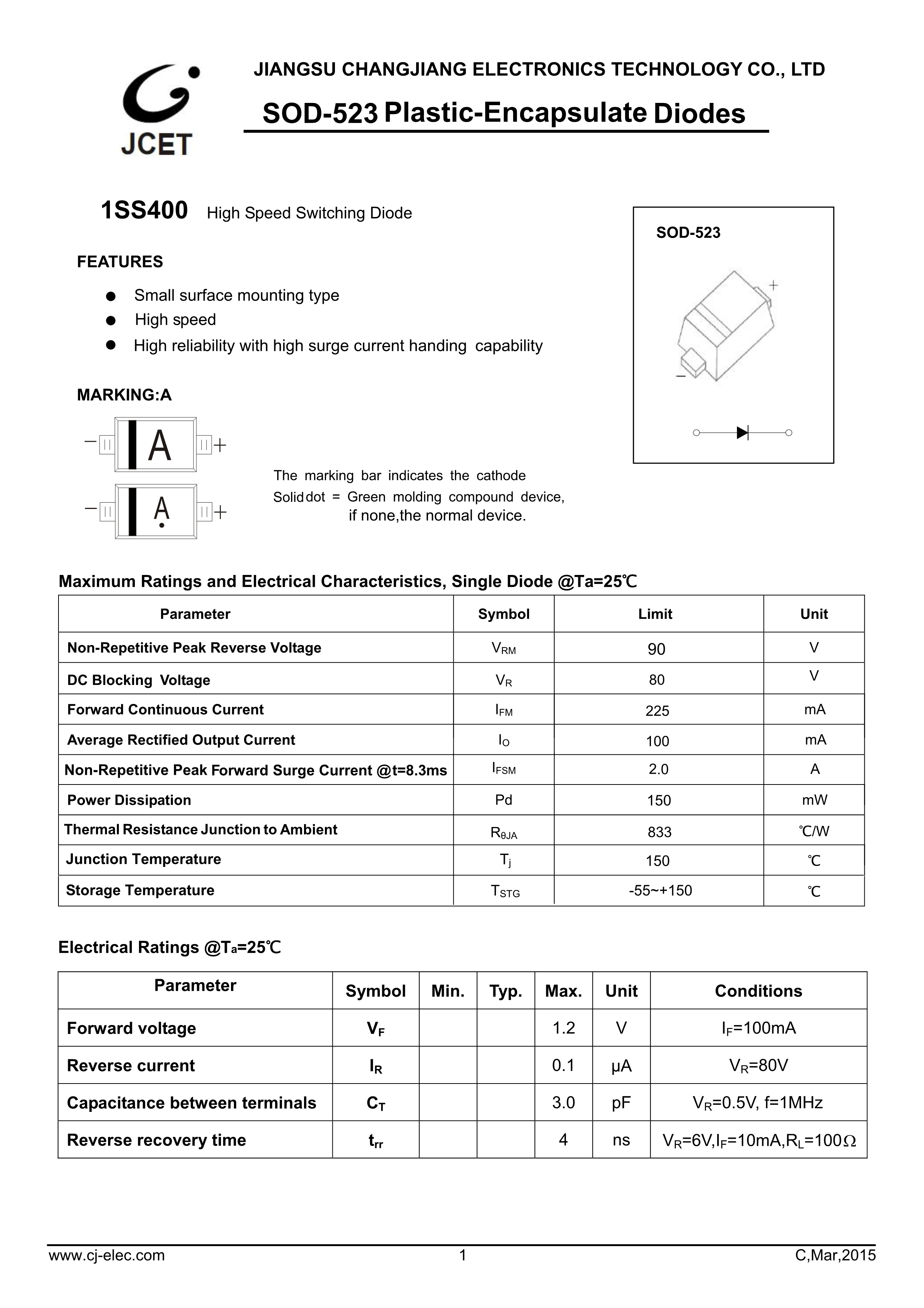 1SS400数据手册SOD-523封装CJ(江苏长电-长晶)PDF规格书,中英文下载